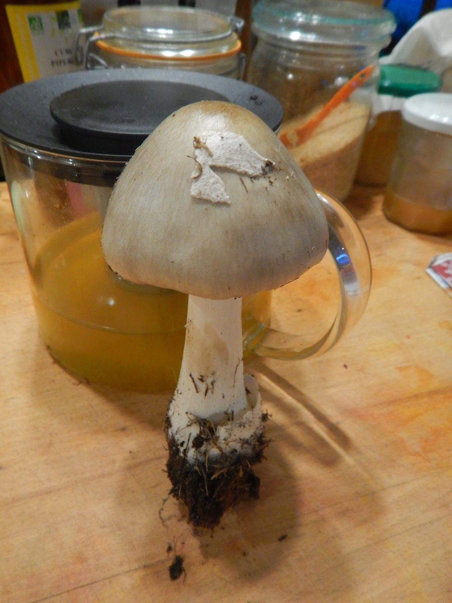 Dein Pilz heißt Volvariella gloiocephala (Größter Scheidling), und neben dem ungerieften Hutrand ist eben die Farbe des Sporenpulvers ein Wichtiges Trennmerkmal von Wulstlingen, und der glatte, schmierige Hut ein UNterscheidungsmerkmal zu allen anderen Scheidlingen (Freiblättler mit rosabraunem Sporenpulver und Universalvelum in Scheidenform an der Stielbasis), weswegen man den auch schon mal in eine eigene gattung gepackt hat ("Volvopluteus" gloiocephalus).