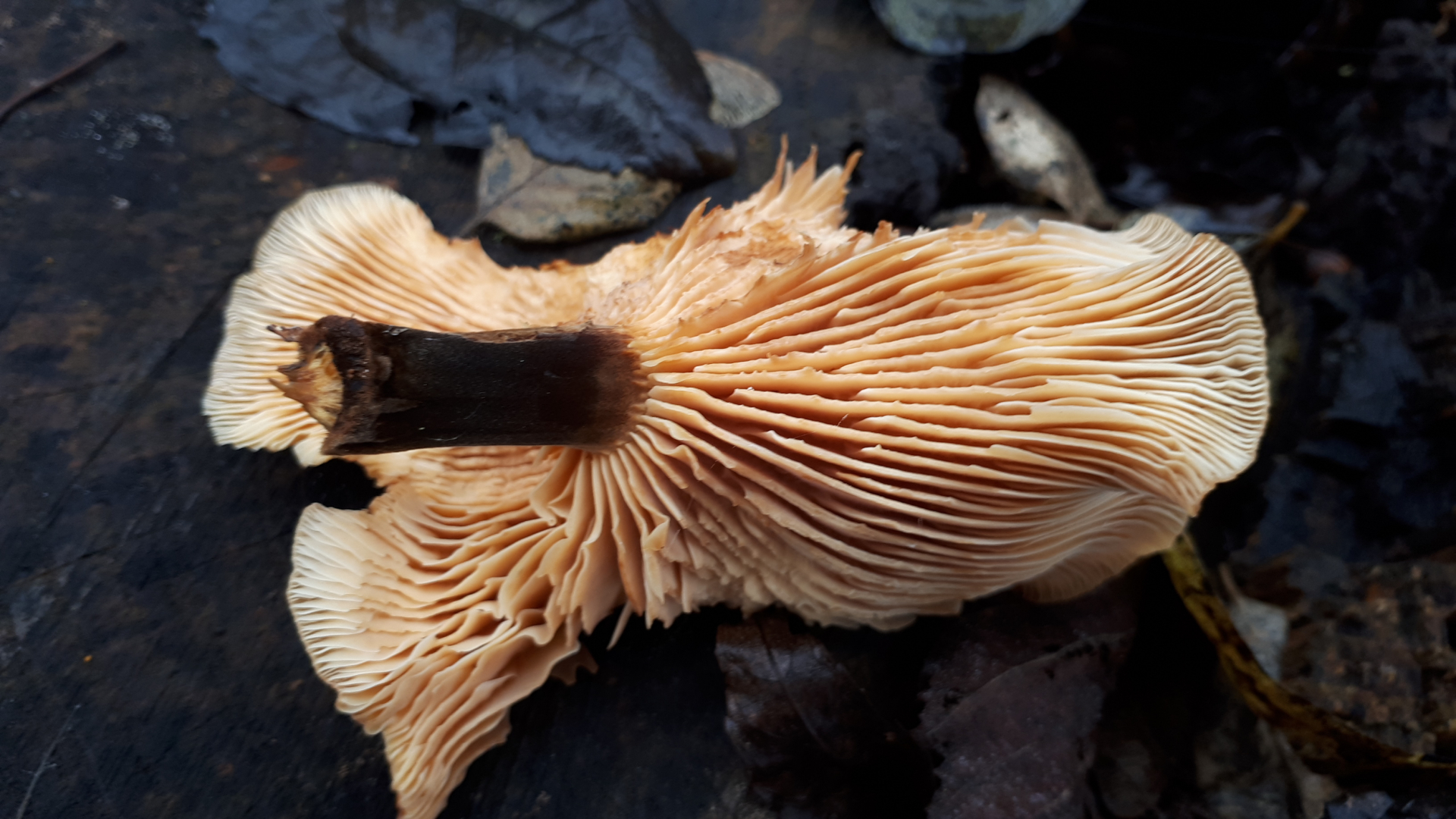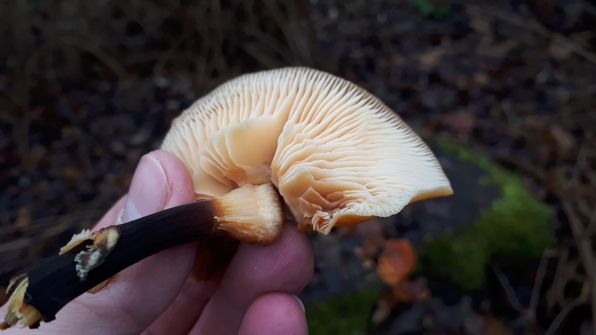 Das einzige,was mich stutzig macht ist der dunkle Stil, der komplett bis zum Hut reicht. Auch die Lamellen auf der Unterseite sind nicht hell/ cremefarben, sondern eher blassorange.