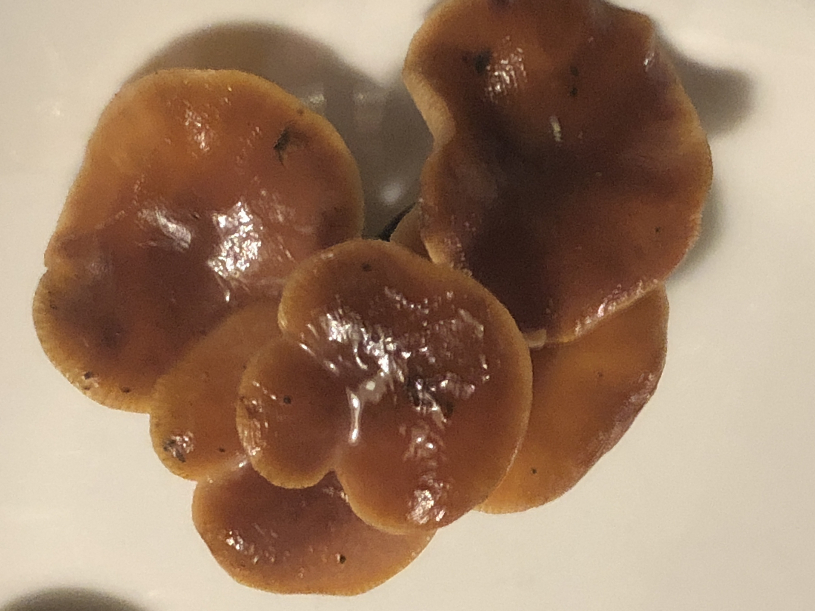 Hut klebrig, Stiele schwarzbraun, freistehende Lamellen, auf unbekanntem Holz gewachsen.
