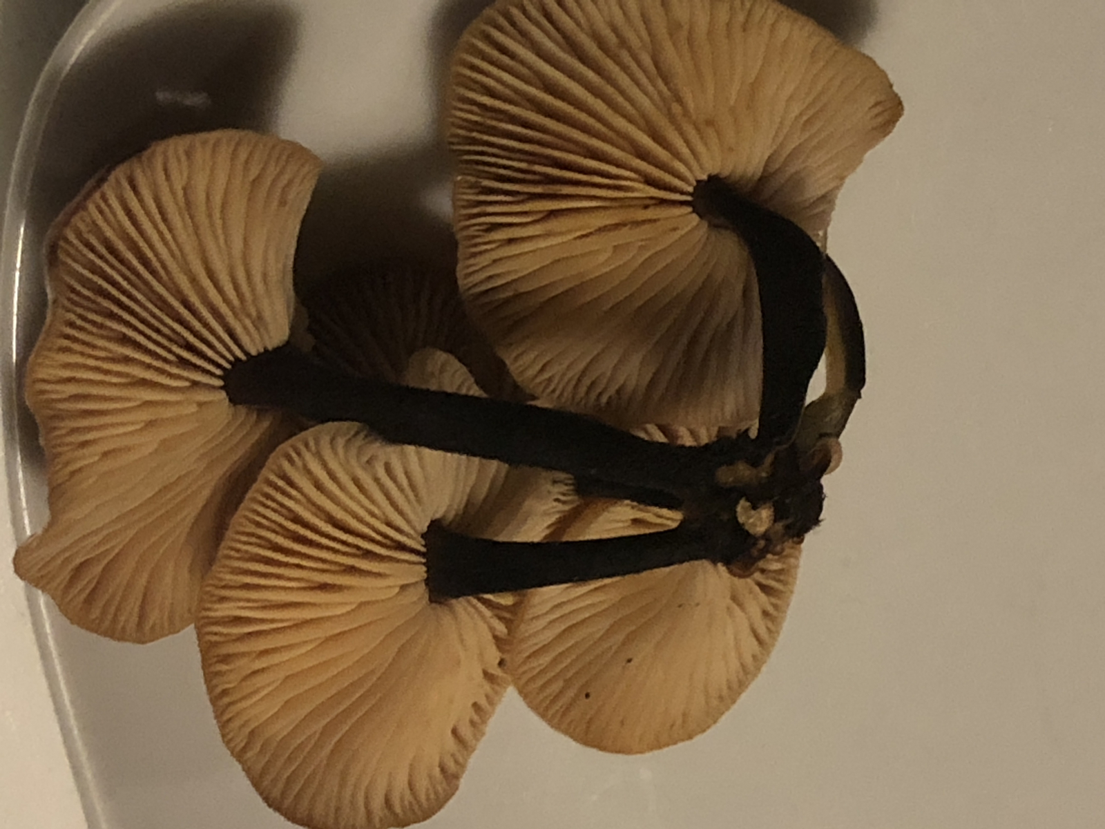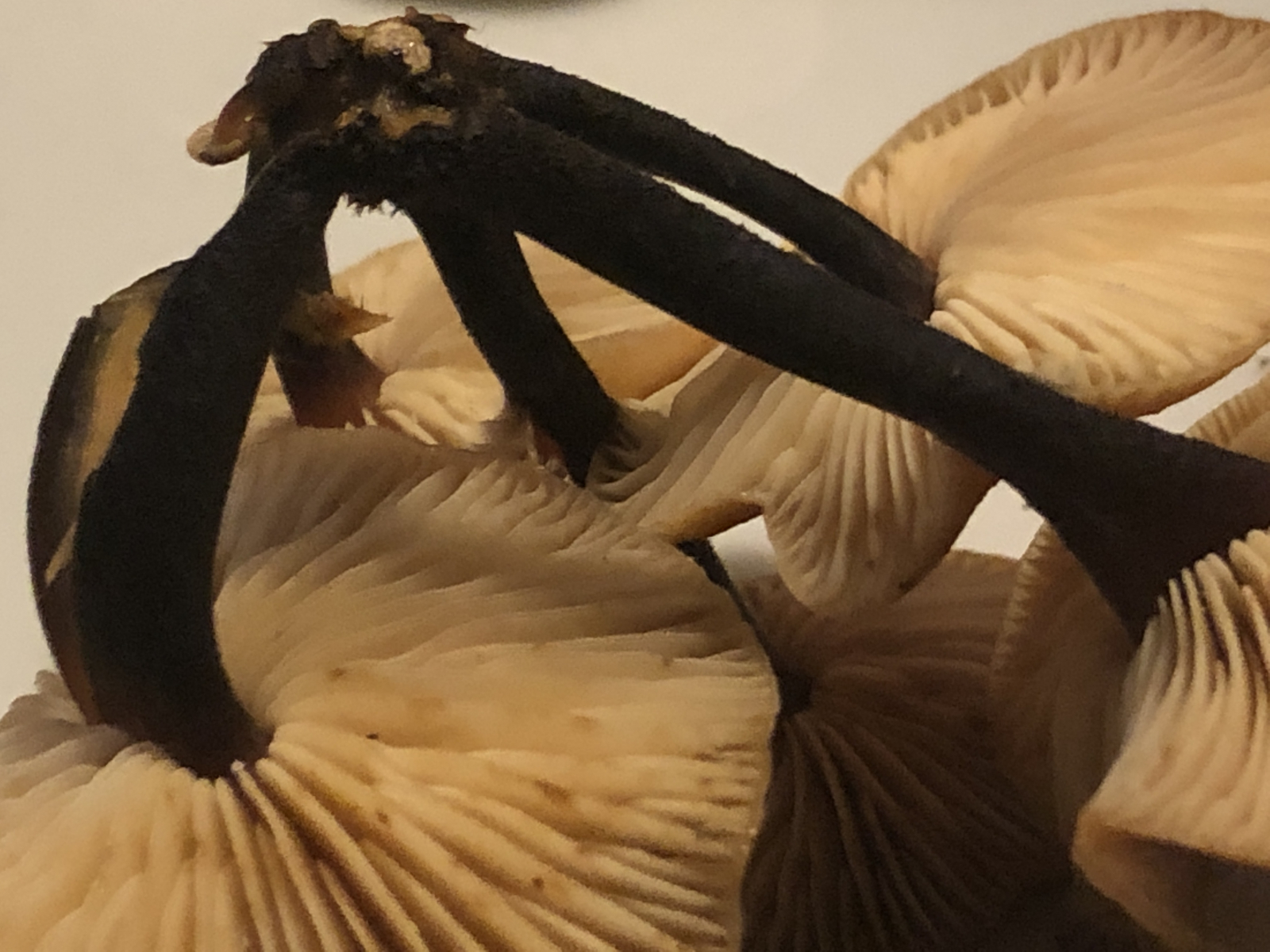 Hut klebrig, Stiele schwarzbraun, freistehende Lamellen, auf unbekanntem Holz gewachsen.