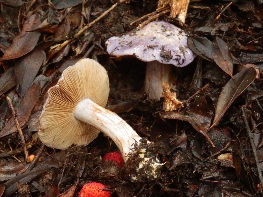 Ich hab an Taubenblauer Schleimkopf (Cortinarius cumatilis) gedacht, aber der braucht Nadelbäume. Violetter Schleierling (Cortinarius violaceus) soll einen genatterten Stiel haben. Was kann das sein?
