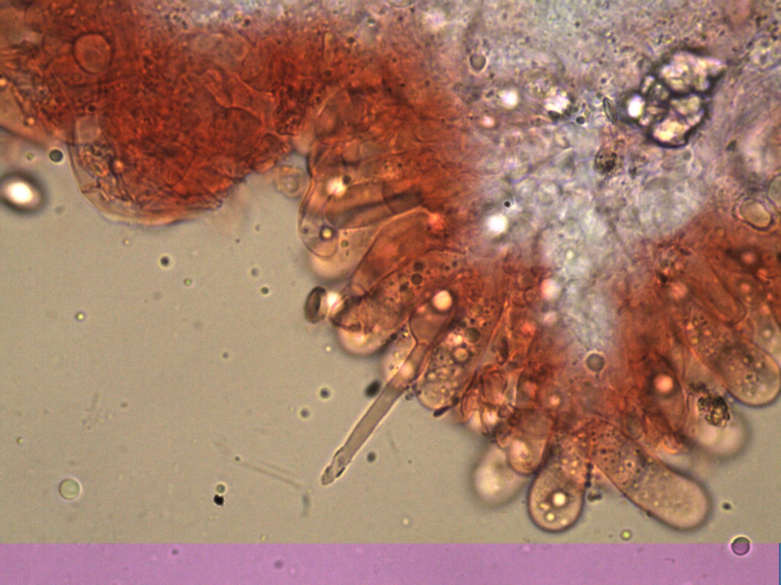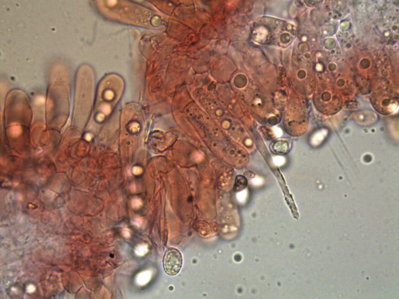 Zystiden Brennhaarförmig, meist septiert und mit Kristallen; Länge ca 31.2 - 51.8µm