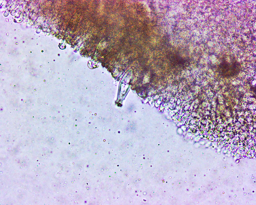Ich dachte zunächst an Mycena, aber die Zystiden (dickwandig, mit Kristallschopf) passen garnicht
