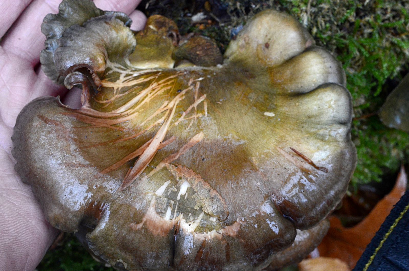 14 Ein handtellergroßer alter Schlappen vom Gelbstieligen Muschelseitling