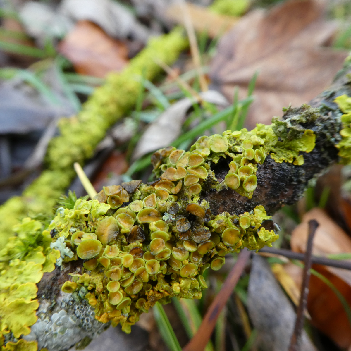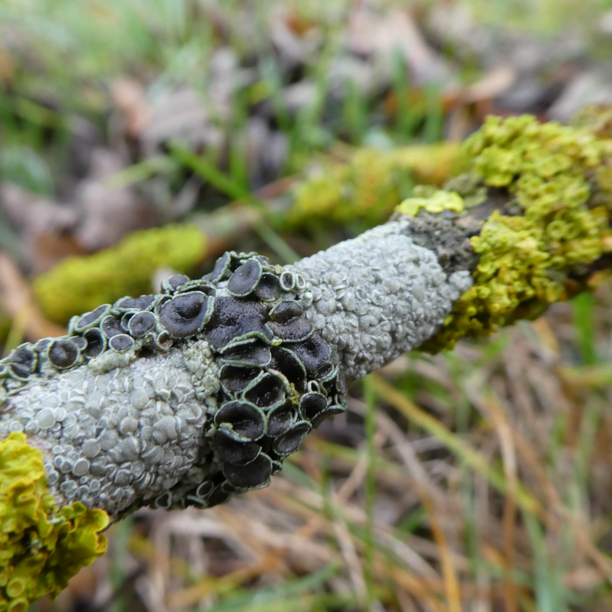 ich hoffe es ist in Ordnung, wenn ich hier im Bestimmungsteil auch nach einer Flechte frage. An mehreren dieser am Boden liegenden Äste wuchsen jeweils verschiedene Flechten zusammen. Kann die eine Flechte Lecanora hagenii ( Hagens Kuchenflechte) sein? Und die zweite müsste doch die Gewöhnliche Gelbflechte (Xanthoria parietina) sein?