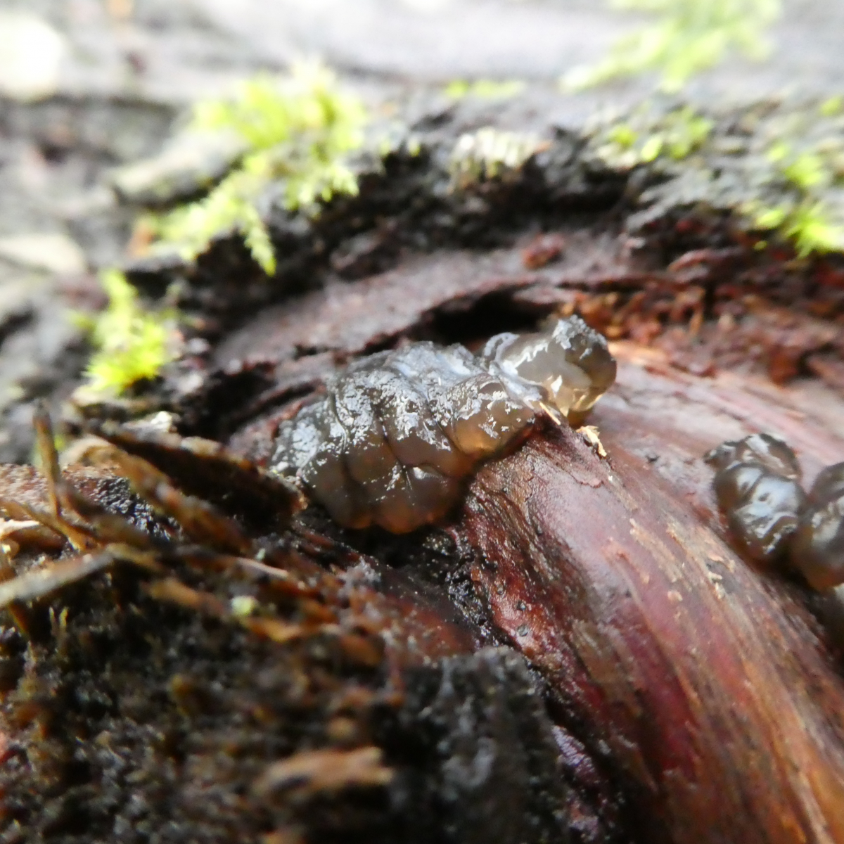 bei diesem Drüsling komme ich nicht weiter. Gefunden habe ich die Pilze heute an einem umgestürzten Laubbaum. Der Baum war voll mit Kreiseldrüslingen, Fleischroten Gallertbechern und einer Vielzahl weiterer Pilze.