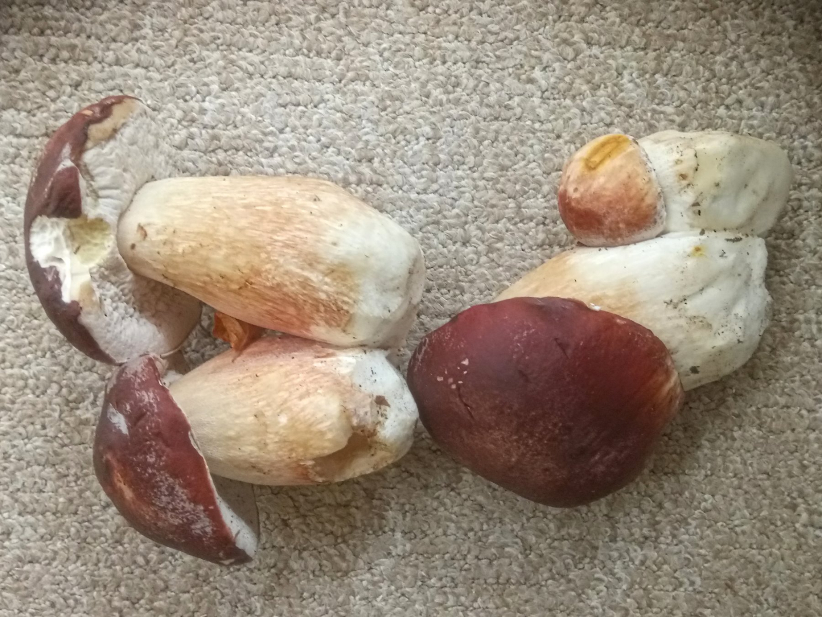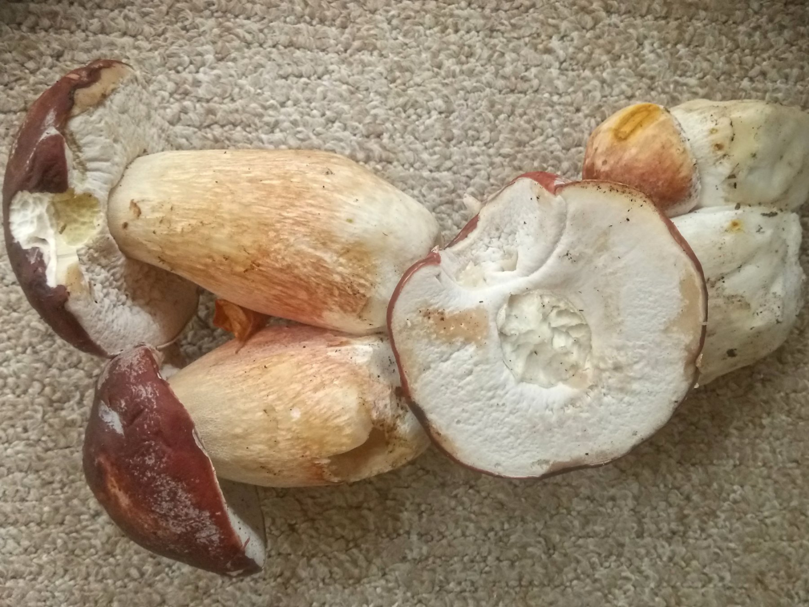Die Bilder habe ich mir mal geben lassen. Es sind keine Sommersteinpilze, mangels an Kiefern auch keine Kiefernsteinpilze. Aber der Gemeine Steinpilz paßt auch nicht so richtig. Schon die Huthaut und die das Fleisch darunter ...........