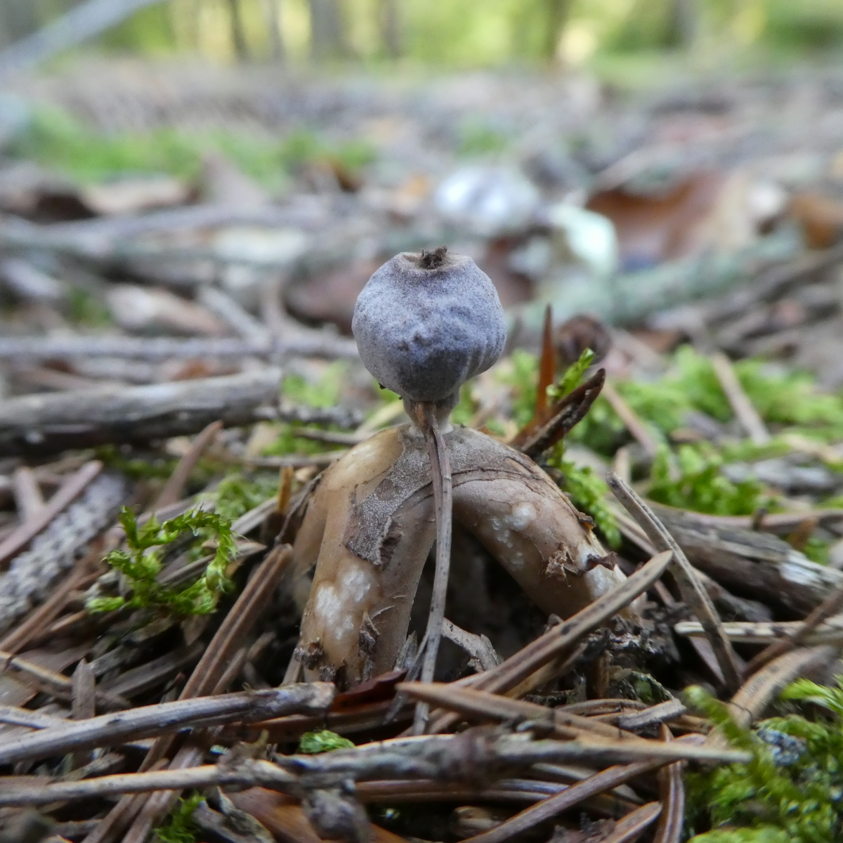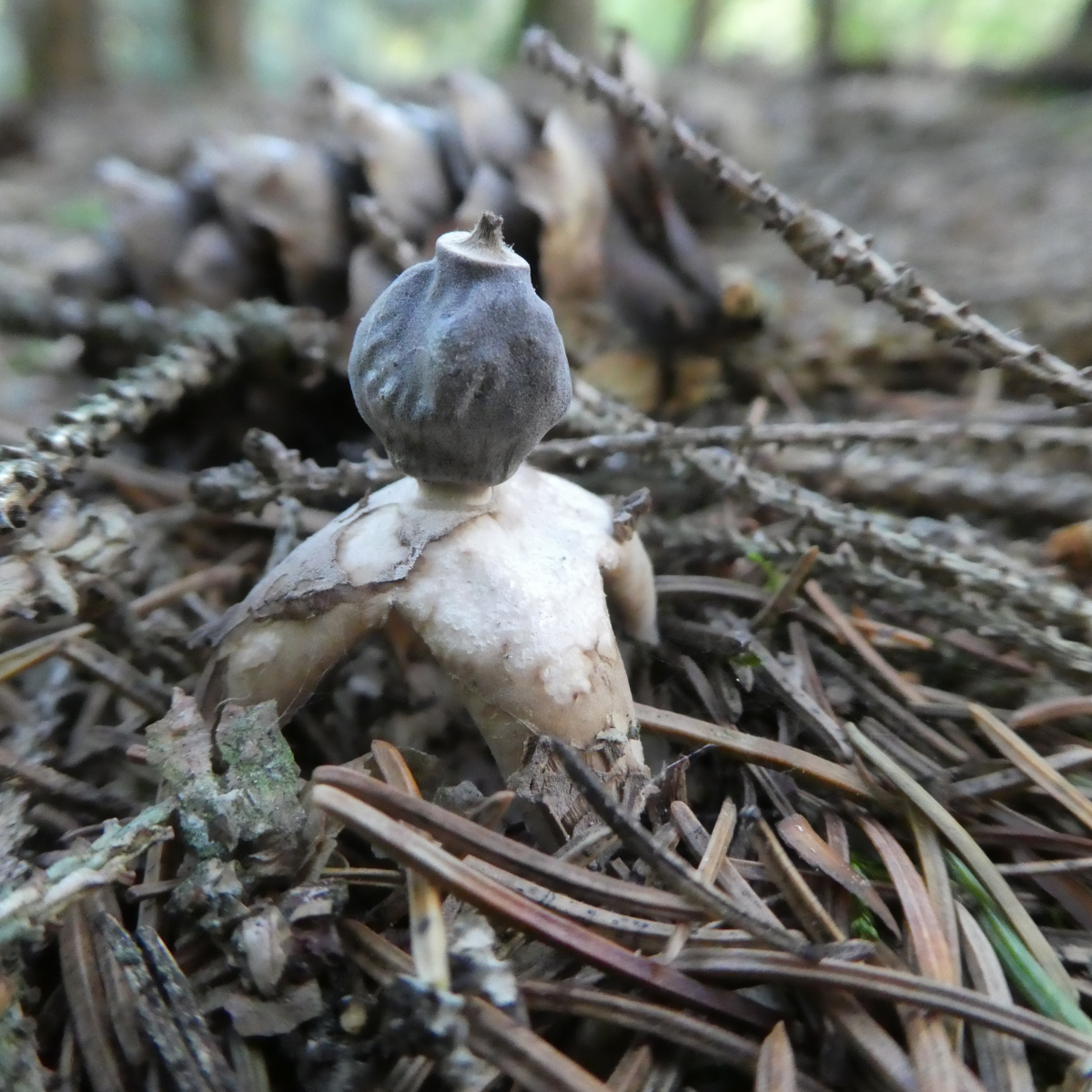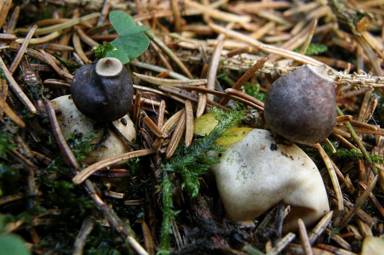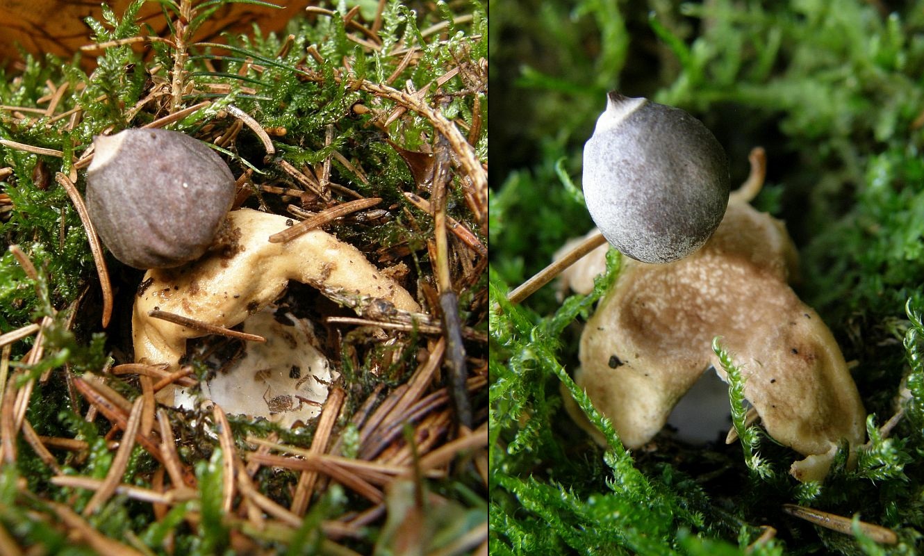 Endoperidie kurz gestielt, kugelig; 0,6 - 1,4 cm breit; hell-beige-grau (jung) bis dunkelgrau-bräunlich/schwärzlich (im Alter); mit stumpfen Warzen;