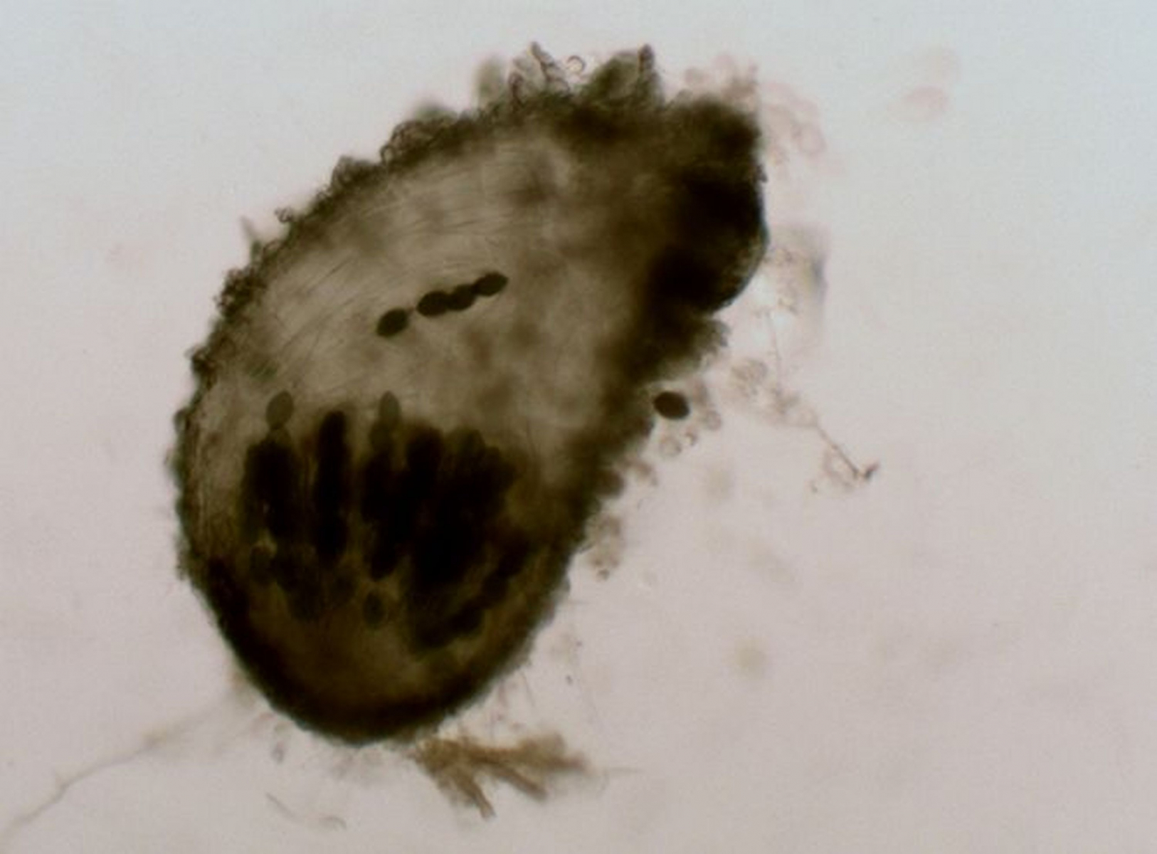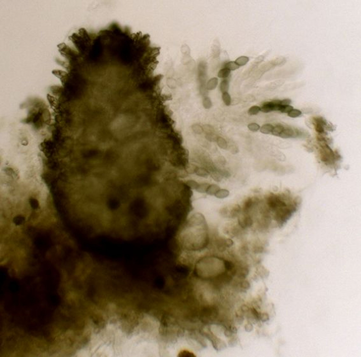 Perithecia semi-immersed, dark brown to blackish, broadly ovoid to pyriform; agglutinated scales 25,5-38,7 μm. Asci 4-spored, cylindric-clavate, 90-125 × 12,5-13 μm. Ascospores uniseriate, apical dark cell (head) 15,30-18,41× 8,92-10,57 μm; olivaceous to dark brown, ellipsoidal, with an apical germ pore, somewhat flattened at the base and a slightly umbonate at the apex; pedicel 10 × 2,2 μm; upper cauda lash-like, the lower one similar, attached to distal end of the pedicel.