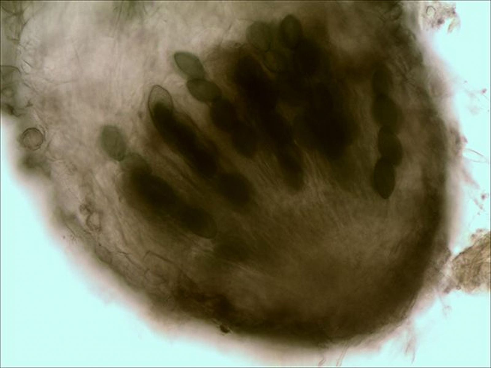 Perithecia semi-immersed, dark brown to blackish, broadly ovoid to pyriform; agglutinated scales 25,5-38,7 μm. Asci 4-spored, cylindric-clavate, 90-125 × 12,5-13 μm. Ascospores uniseriate, apical dark cell (head) 15,30-18,41× 8,92-10,57 μm; olivaceous to dark brown, ellipsoidal, with an apical germ pore, somewhat flattened at the base and a slightly umbonate at the apex; pedicel 10 × 2,2 μm; upper cauda lash-like, the lower one similar, attached to distal end of the pedicel.