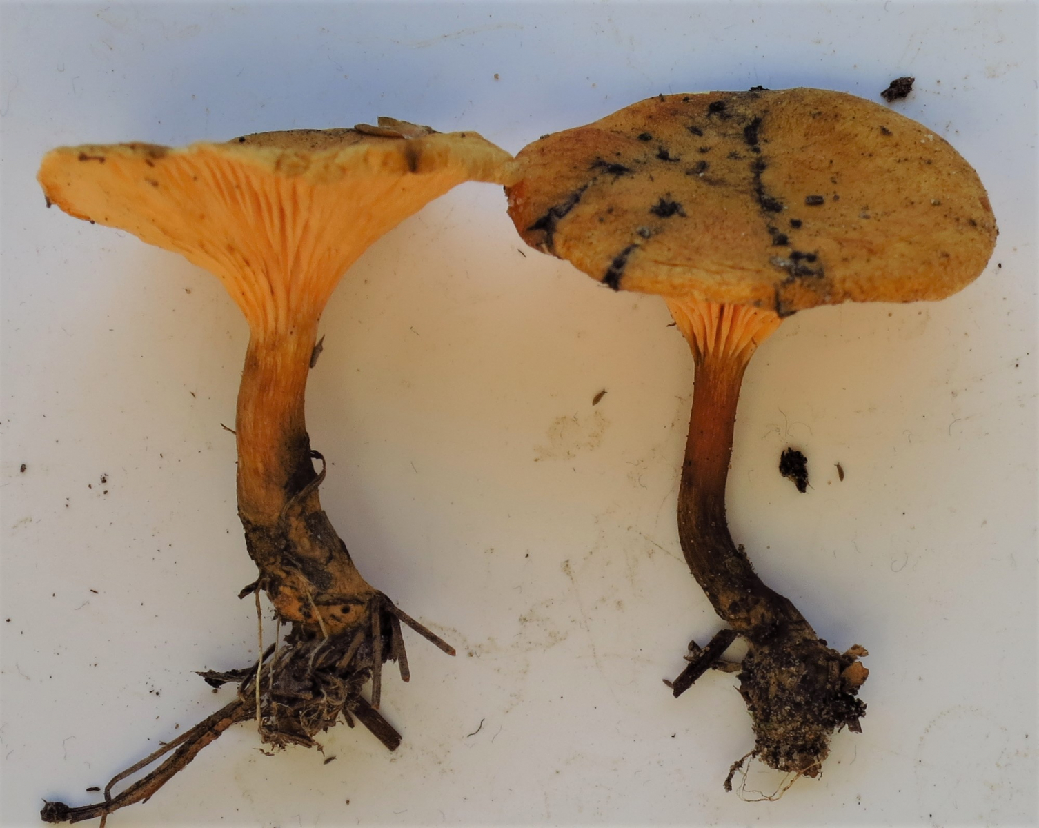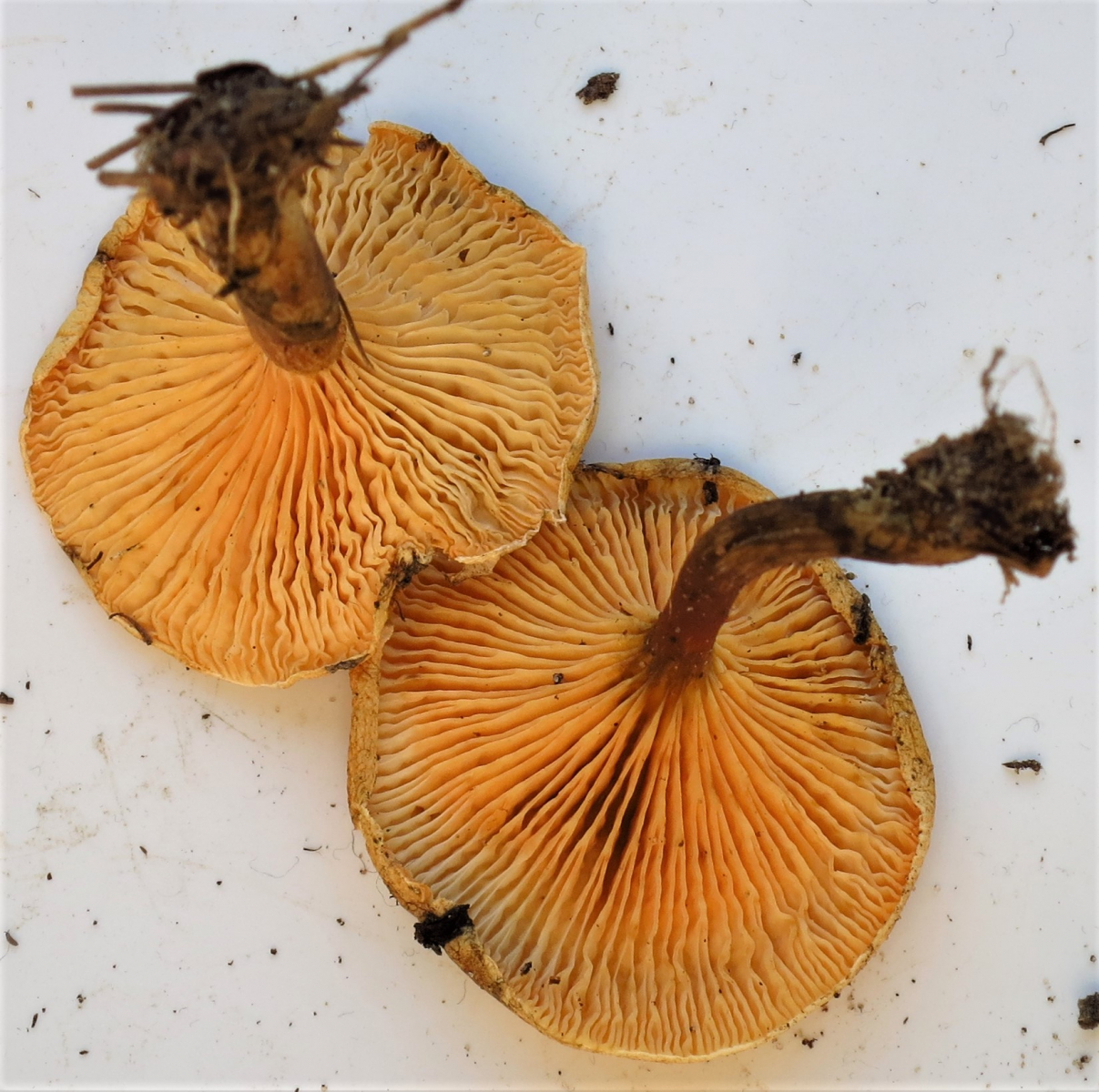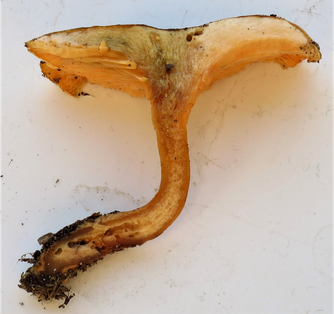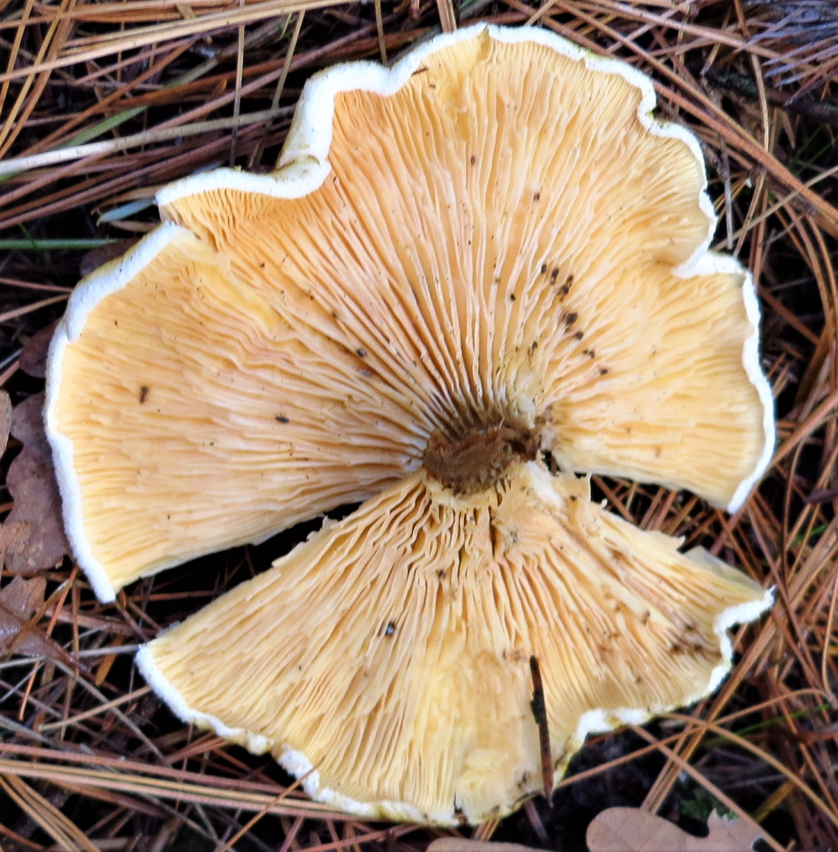 weil die Lamellen gelb waren (die Bilder täuschen etwas) und bei den größeren Exemplaren wurden sie heller in Richtung weiß. Auch der braune Stiehl bis hin zu dunkelbraun kenne ich von hier so nicht. Der gewöhnliche Falsche Pfifferling hat hier eigentlich immer kräftig orange Lamellen und nicht einen so dunklen Stiehl.