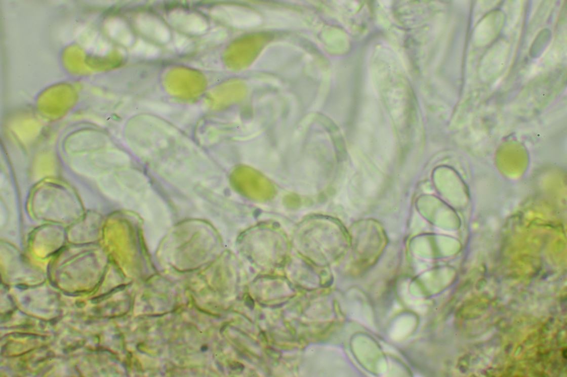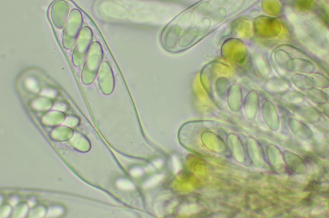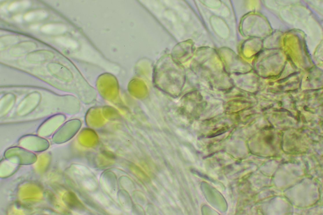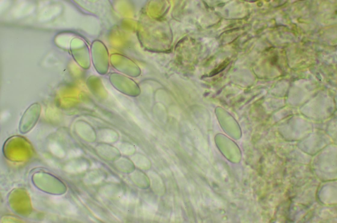 Fruchtkörper 0.12-0.17 mm, also für mich die unterste Toleranzgrenze, was ich noch auf den Objektträger kriege. Mikroskopie: Alles vital in Leitungswasser. Asci turgeszent, biseriat 45-65 x 11-12 mü. Paraphysen zylindrisch, septiert, 1.5 - 2 mü. kopfig erweitert bis 10 mü., mit leuchtend gelbem Inhalt an der Spitze. Sporen elliptisch, etwas birnenförmig, glatt, 7.5-9.2 x 4.2-4.8 mü., ohne Tropfen, mit lichtbrechendem Inhalt. Ektales Excipulum aus Textura globulosa angularis.