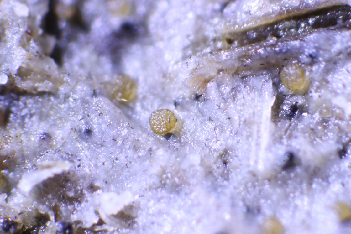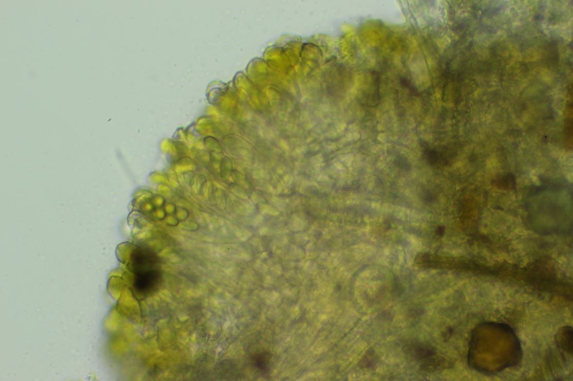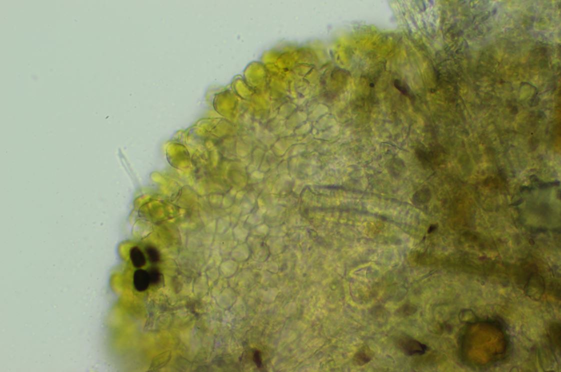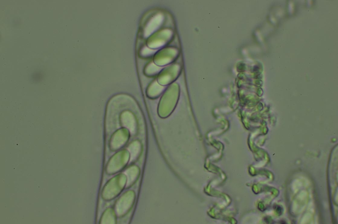 Fruchtkörper 0.12-0.17 mm, also für mich die unterste Toleranzgrenze, was ich noch auf den Objektträger kriege. Mikroskopie: Alles vital in Leitungswasser. Asci turgeszent, biseriat 45-65 x 11-12 mü. Paraphysen zylindrisch, septiert, 1.5 - 2 mü. kopfig erweitert bis 10 mü., mit leuchtend gelbem Inhalt an der Spitze. Sporen elliptisch, etwas birnenförmig, glatt, 7.5-9.2 x 4.2-4.8 mü., ohne Tropfen, mit lichtbrechendem Inhalt. Ektales Excipulum aus Textura globulosa angularis.