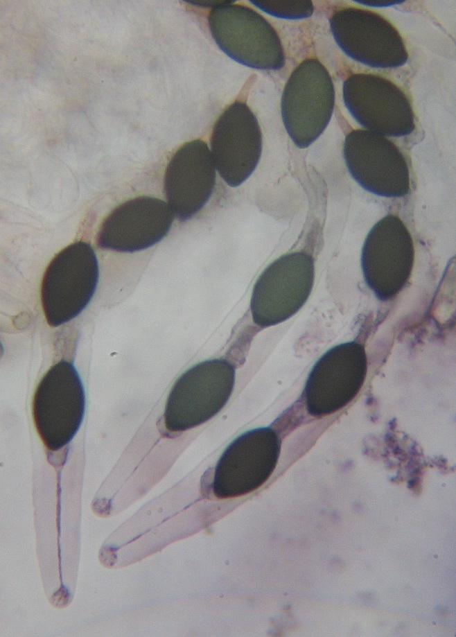 und der Sporengröße19 x12µ, Pedicel 6-10 x 2µ, und Asci :160-180 x 18µ