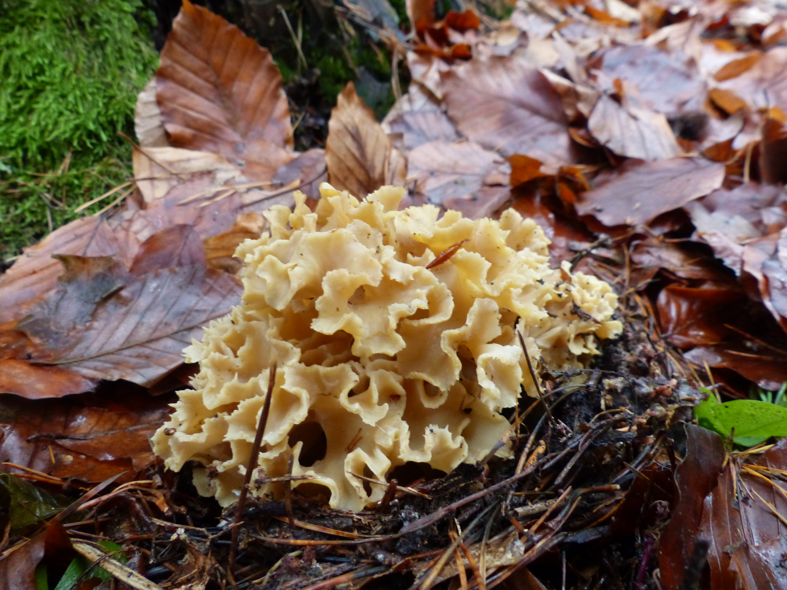 Wir gingen fast daran vorbei. Aber eben nur fast. Rüdiger möchte gerne mal probieren, wie sie in einer Hühnersuppe schmeckt. Wir haben welche eingekocht. Und da soll sie dann rein. Also haben wir sie mitgenommen und sie liegt auf dem Dörrex. Eine krause Glucke.