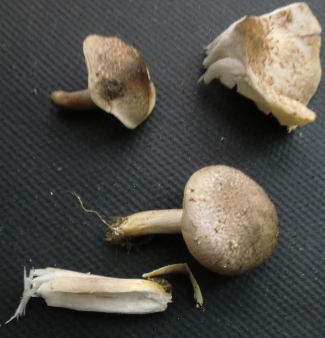 Diese zeigen nach ca. 24 h ein ganz leichtes Gilben in der Stielrinde (die beiden unteren Fruchtkörper im letzten Bild), entsprechend würde ich sie in die Gruppe um Tricholoma agyraceum sortieren.