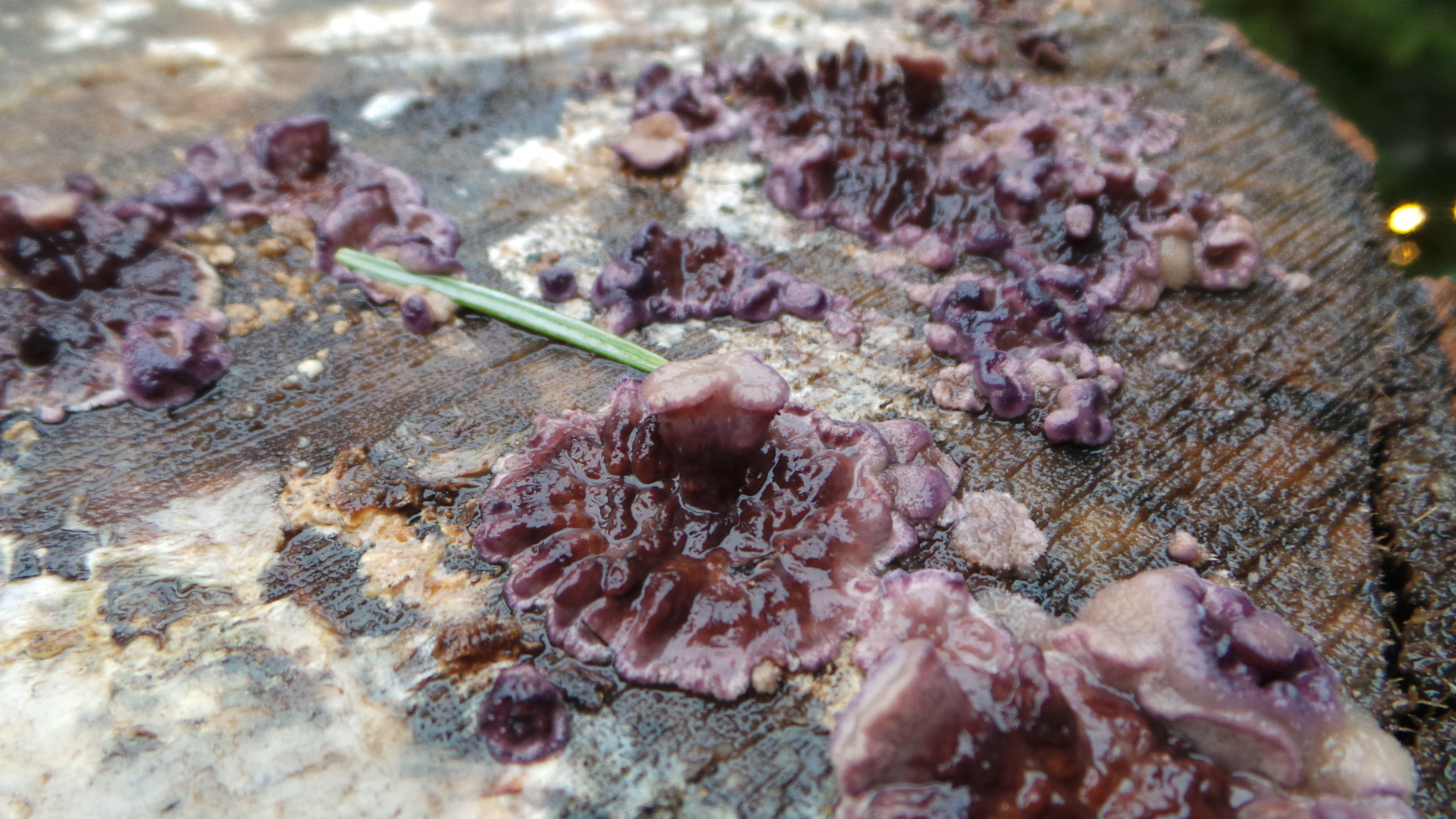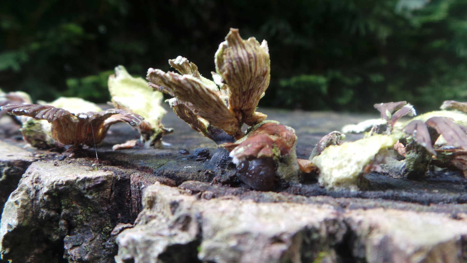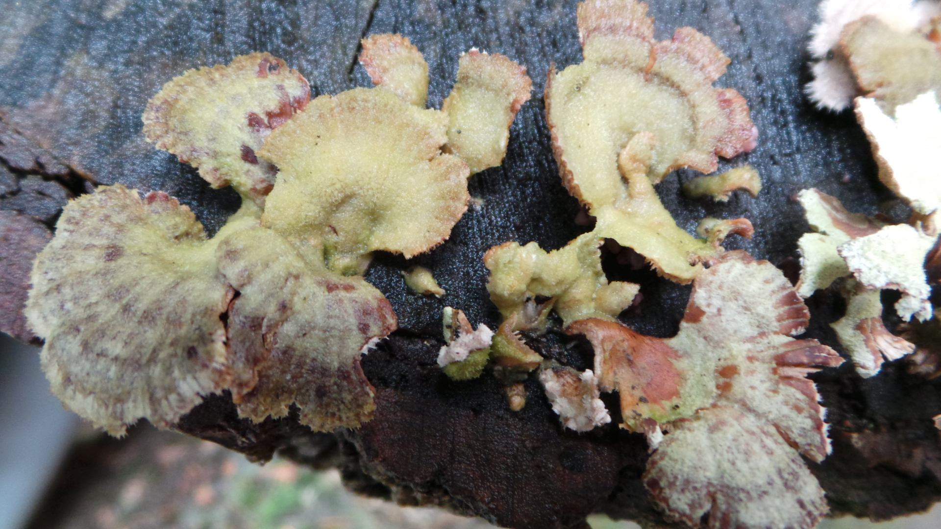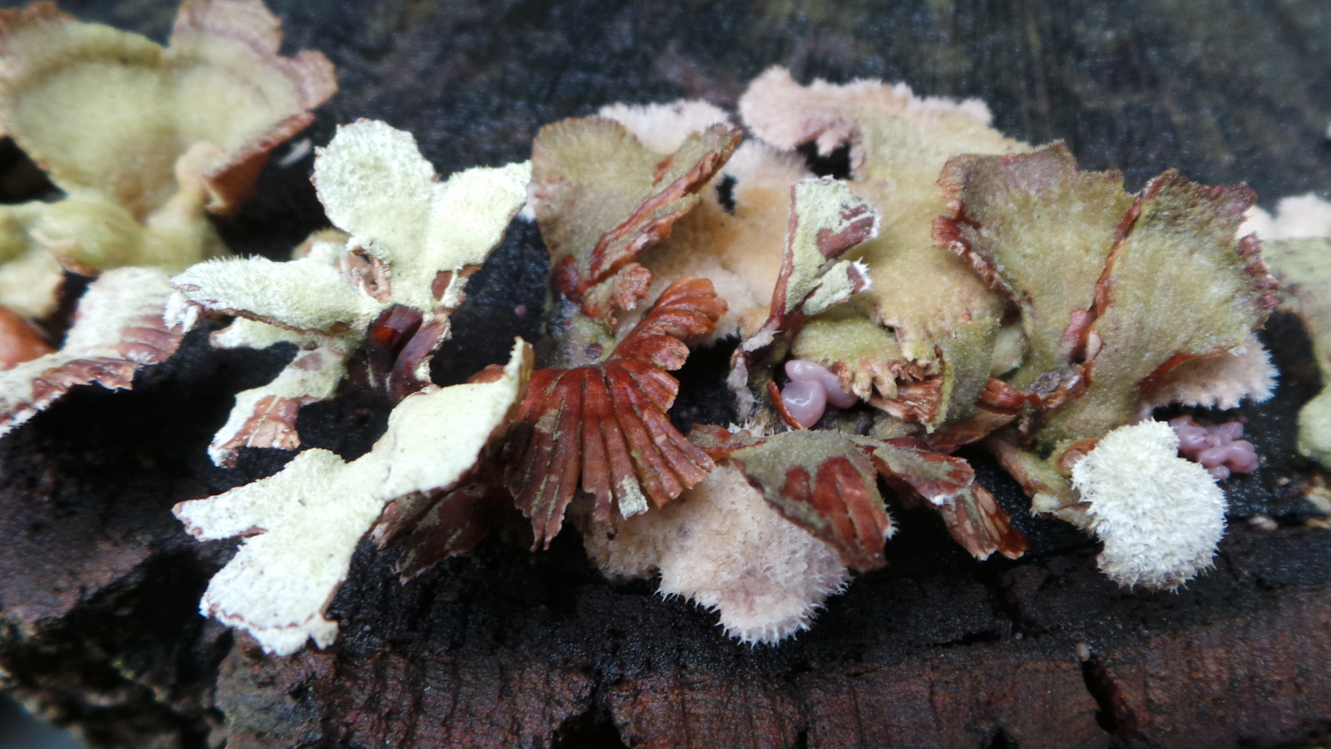 Das Weidenstammholz wurde im April 2017 geschnitten. Im Herbst 2017 wuchsen diese nun erst seit wenigen Tagen farbigen Gebilde, welche anfangs schneeweiß, dann schmutzigweiß waren.