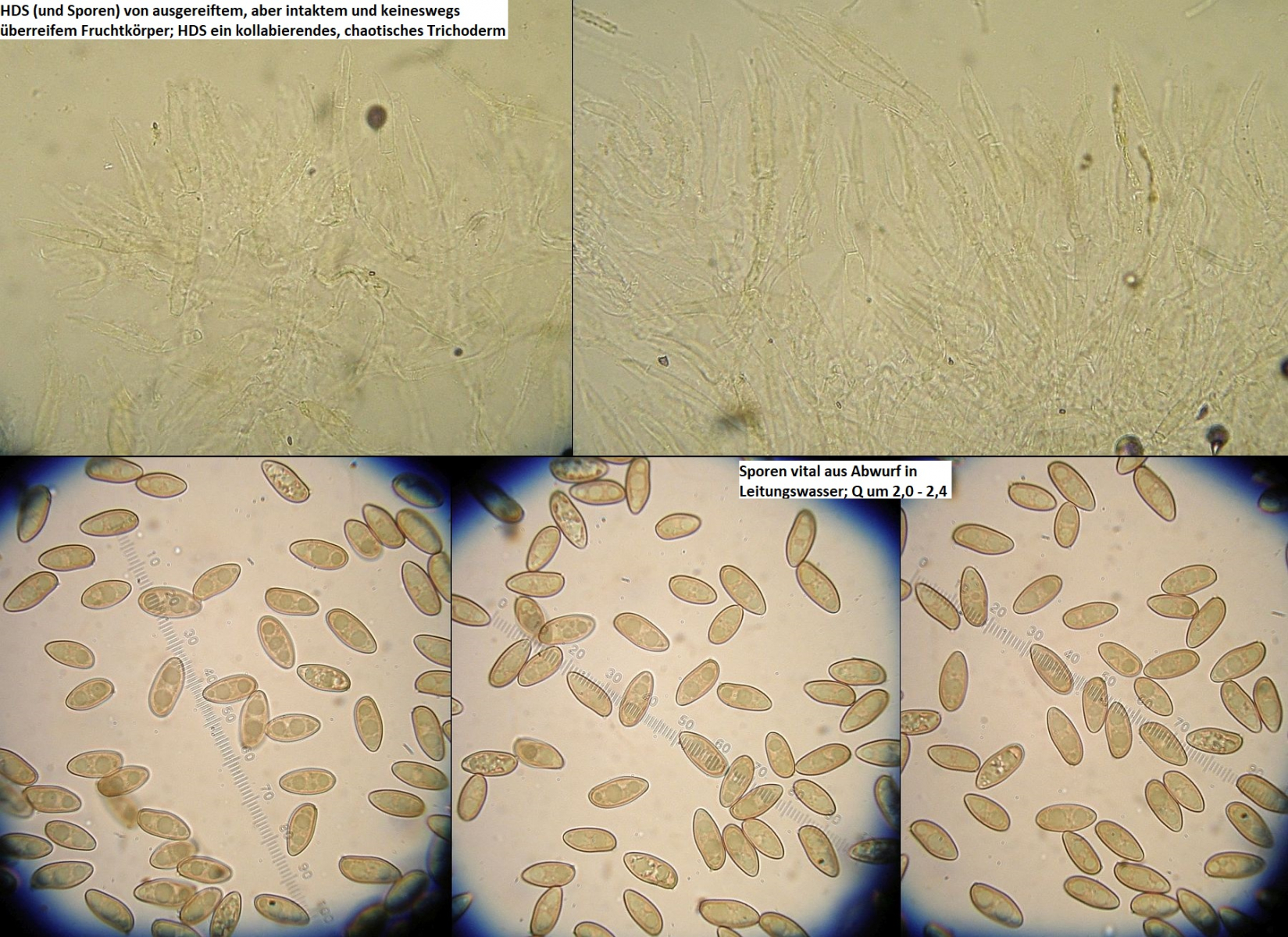 Um einen sinnvollen Qm zu ermitteln, sollte man schon mindestens 15-20 Sporen messen, und zwar aus dem Abwurf eines voll aufgeschirmten, aber noch nicht überalterten Fruchtkörpers, dabei unbedingt in Leitungswasser (oder KOH3%), auf keinen Fall in anderen Medien oder Reagenzien oder gar Färbemitteln, außerdem ausschließlich Sporen messen, die in einer Ebene und auf der Seite liegen (siehe Position des Apikulus). Ansonsten (falls eines davon nicht zutrifft) kannst du die Werte bei so feinen Unterschieden vergessen.