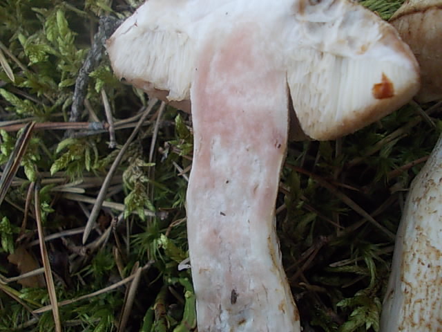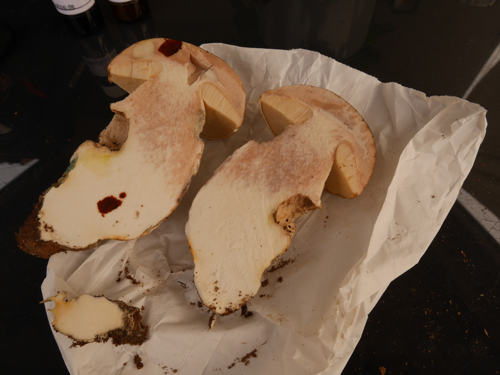 Zu L. cyaneobasileucum passt gar nicht (siehe hierzu auch das Portrait Leccinum cyaneobasileucum von Pablo), dass der Pilz im Längsschnitt im Hut und der oberen Stielhälfte zunächst lansam rosa anläuft, um dann nach ein bis zwei Stunden graubläulich zu werden.