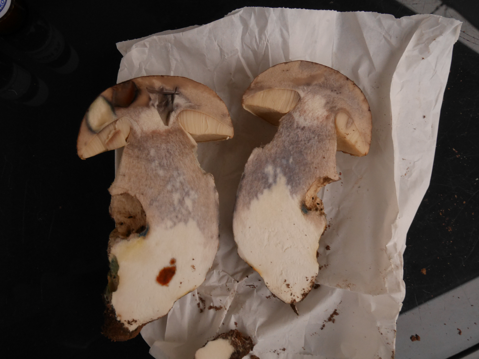 Zu L. cyaneobasileucum passt gar nicht (siehe hierzu auch das Portrait Leccinum cyaneobasileucum von Pablo), dass der Pilz im Längsschnitt im Hut und der oberen Stielhälfte zunächst lansam rosa anläuft, um dann nach ein bis zwei Stunden graubläulich zu werden.