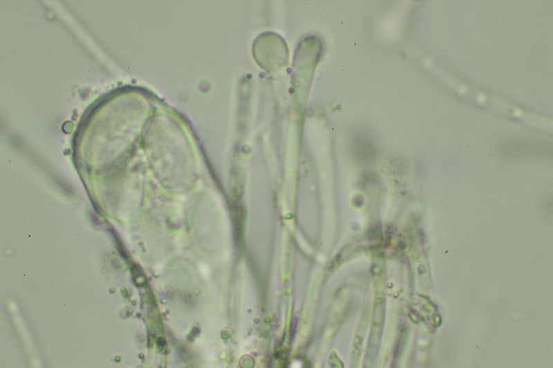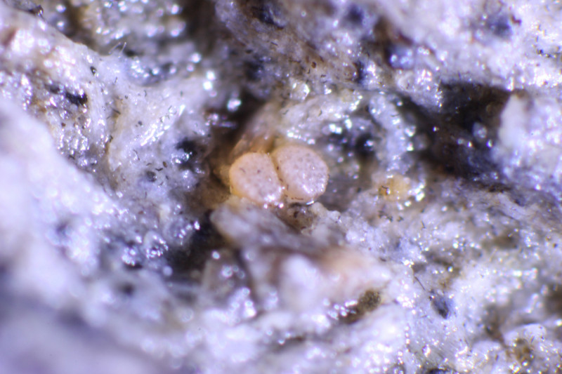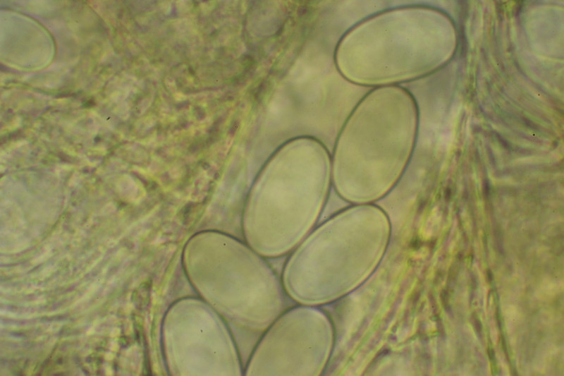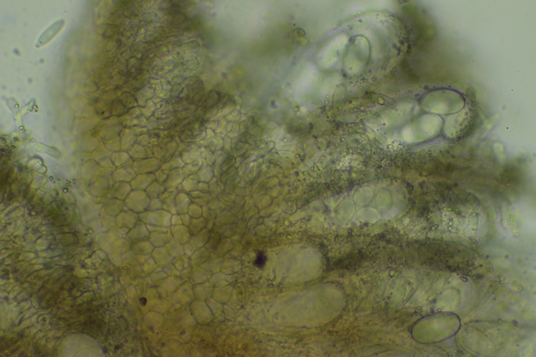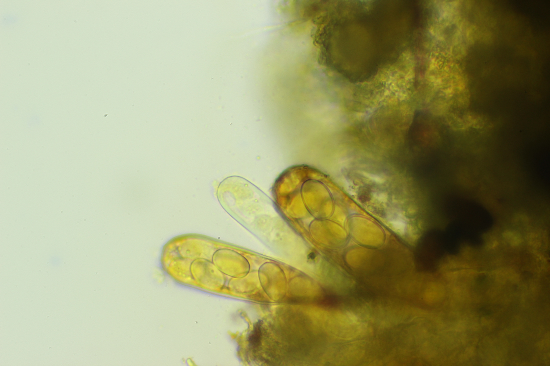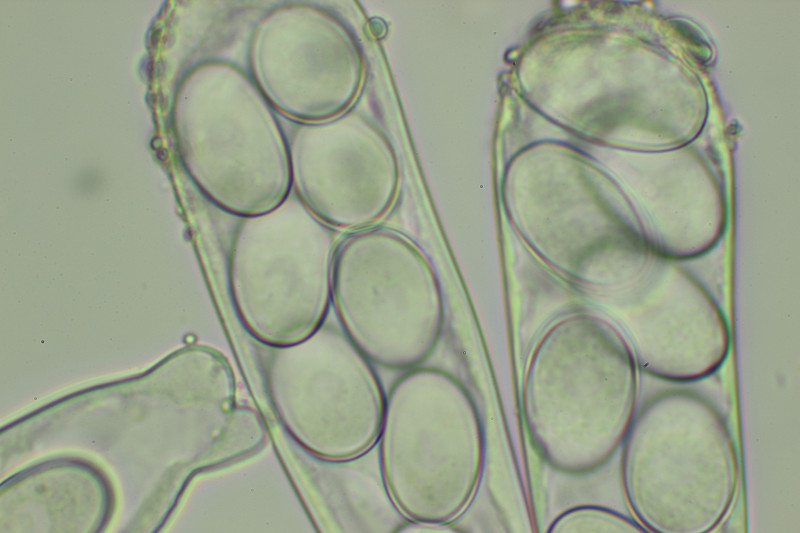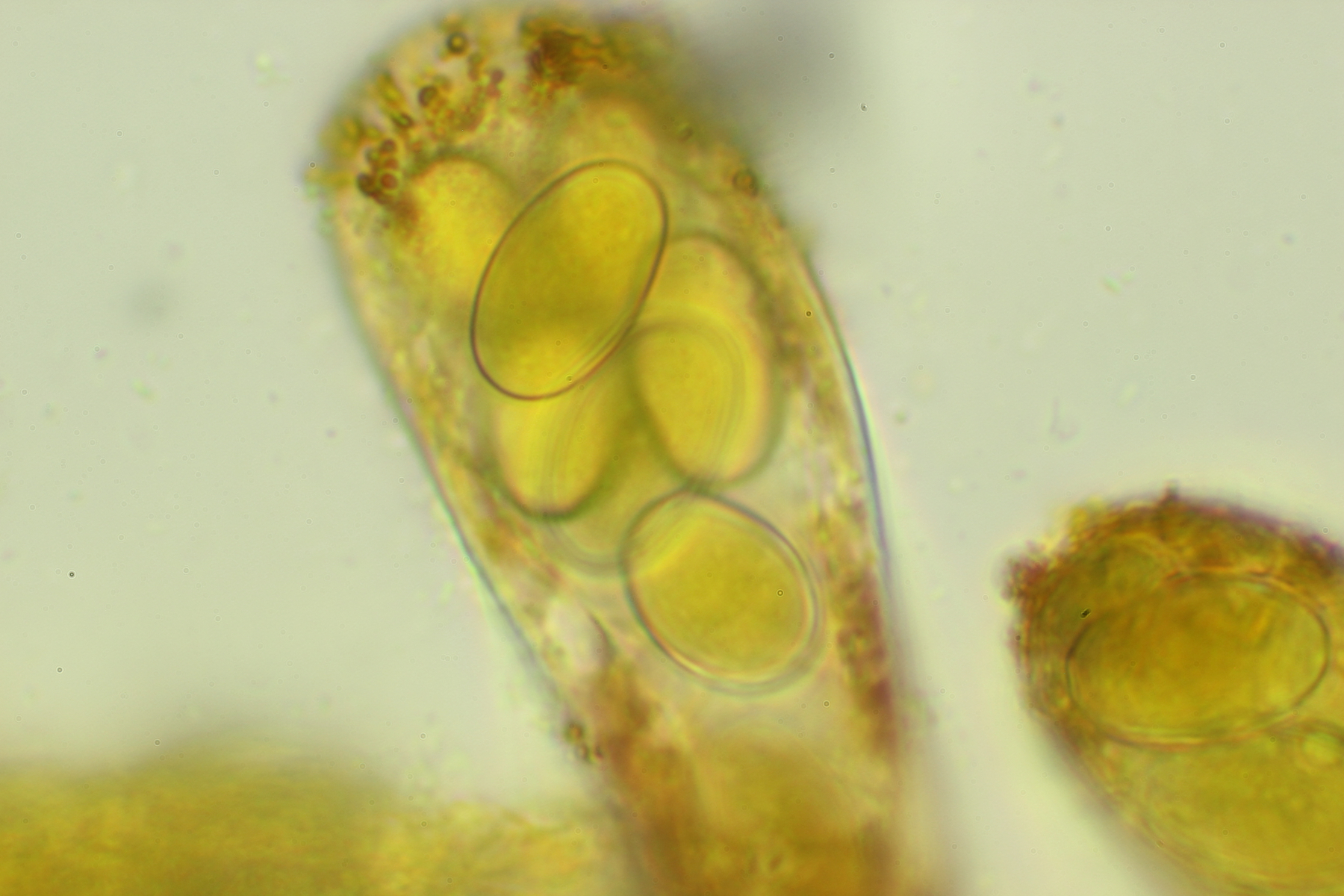 Mein neuerlicher Fund (auf Kuhfladen) denke ich könnte zu Coprotus passen. Am nächsten vielleicht zu C. leucopocillum. Die wenigen Exemplare haben die Masse von 0.2-0.25mm im Durchmesser und sind schön rosafarben. Meine Sporen in Leitungswasser sind aber meiner Meinung nach viel zu gross für leucopocillum. Meine Sporen sind mehr oder weniger elliptisch, vital bei (18)(18.5)19-22 x 11-12(13) mü. Die Asci sind in Lugol negativ, in Leitungswasser biseriat, vital 98-125 x 26-31 mü. mit Basishaken. Die Paraphysen apikal leicht keulig erweitert bis 6 mü., ohne Farbpigmente. Das Ektale Excipulum besteht aus Angulariszellen. Auffallend tropfenbildende amorphe Masse im Hymenium, teilweise die Asci überlagernd.