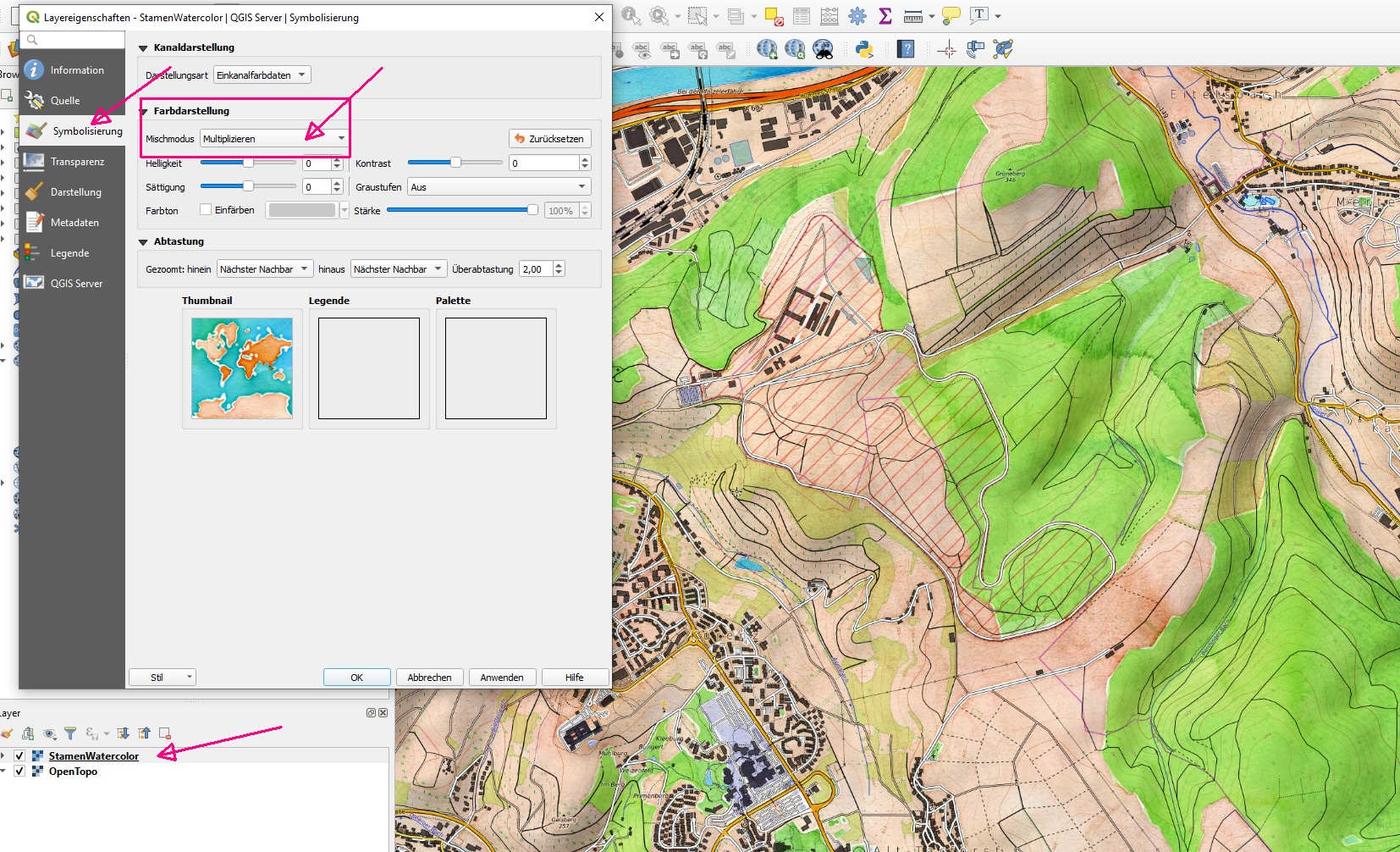 Eine sehr schöne nostalgisch wirkende Karte erhält man, wenn man die Stamen Watercolor Map (oben) und die OpenTopo Map (unten) übereinander legt und bei der Stamen-Karte (Rechtsklick) unter Eigenschaften/Symbolisierungen den Mischmodus auf Multiplizieren umstellt.