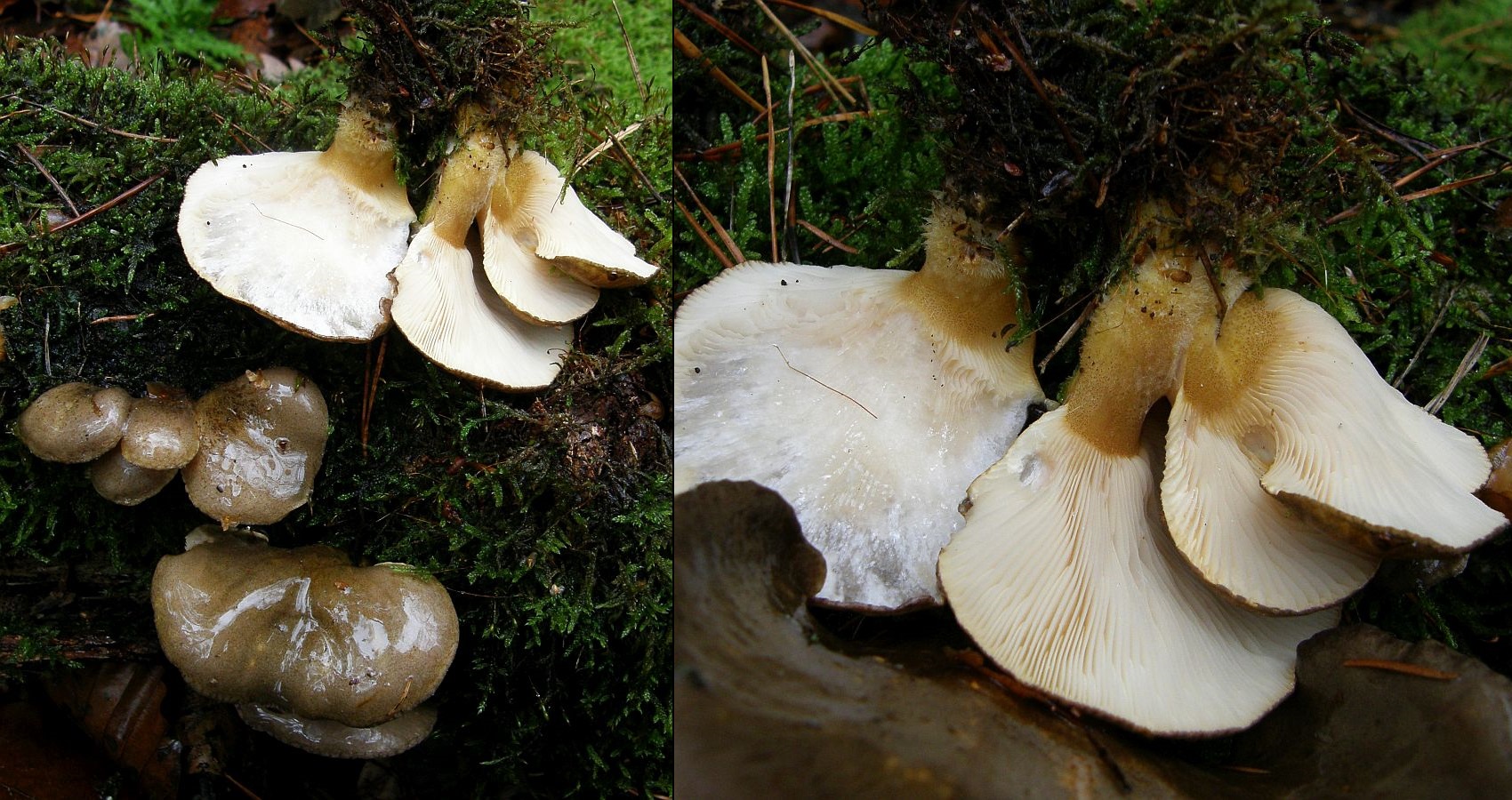 Strobilurus esculentus (Fichtenzapfenrübling, rechts links) & Baeospora myosura (Mäuseschwanz, links rechts)