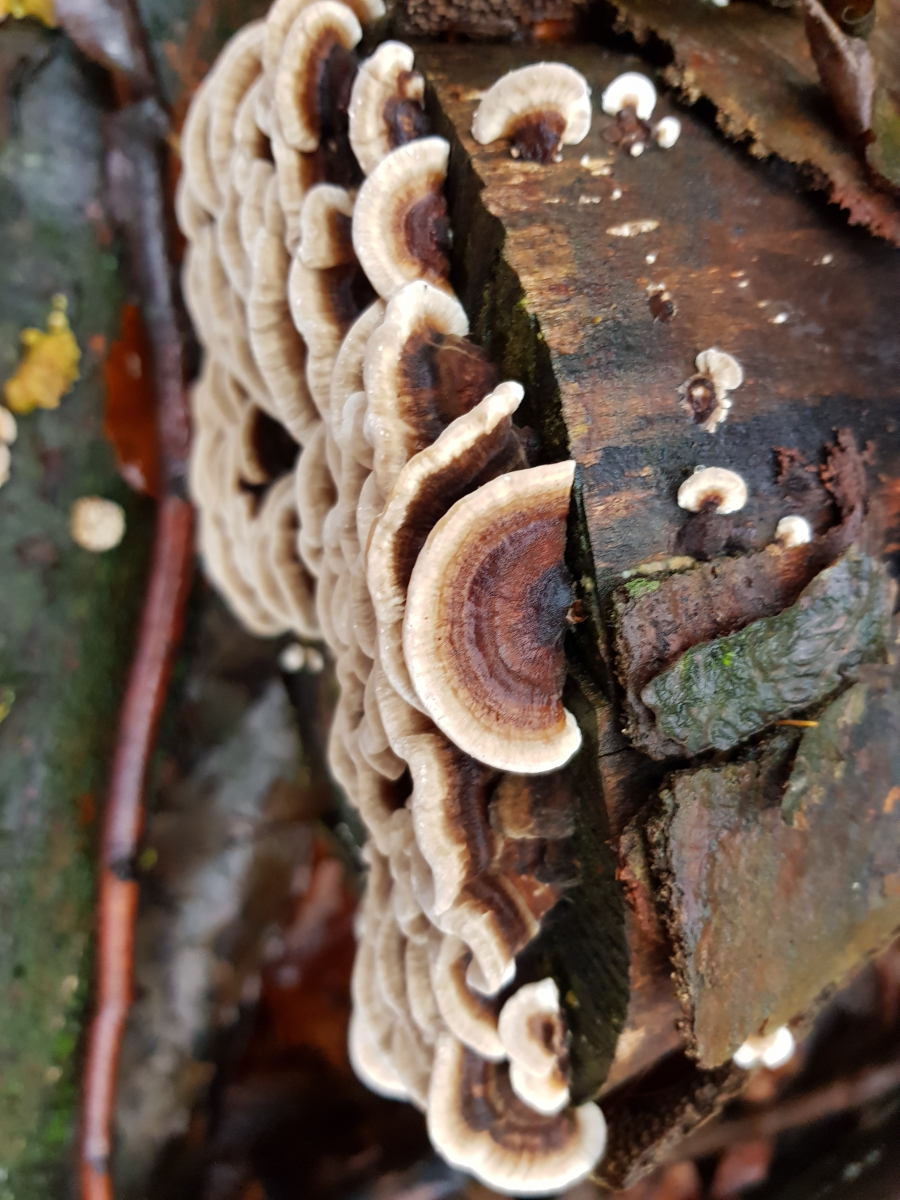Und meistens sieht man auch, wie sie aneinanderwachsen, also mit der Ausrede, dass die helle Ocker-Tramete mal wieder bei der Schmetterlings-Tramete wächst, kommt man zuweilen nicht durch.