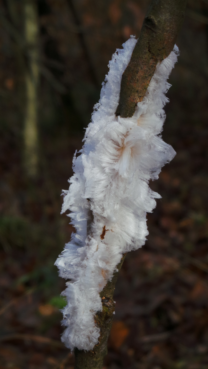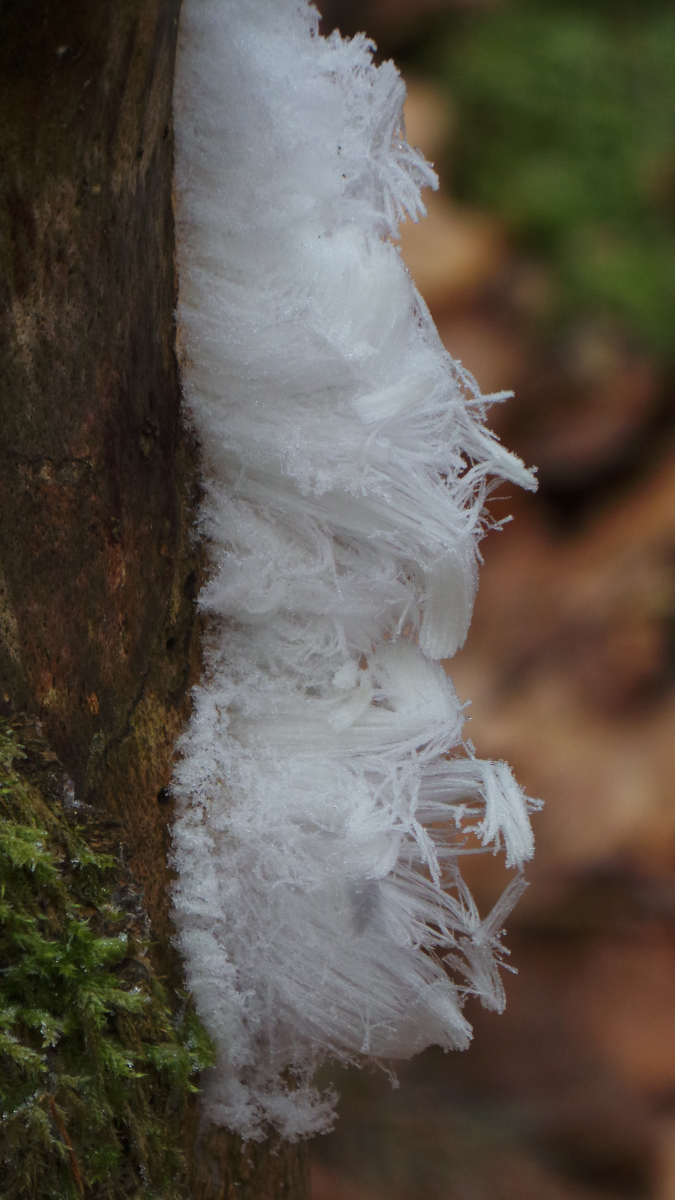 Heute morgen auf dem Marsch durch den Wald zur Weihnachtsgans auf den anderen Berg haben wir gehäuft Haareis auf Totholz gesehen. Nachts hatte es ca -1,5°C, beim Fotografieren gegen 11.00 Uhr ca 0 - 1°C.