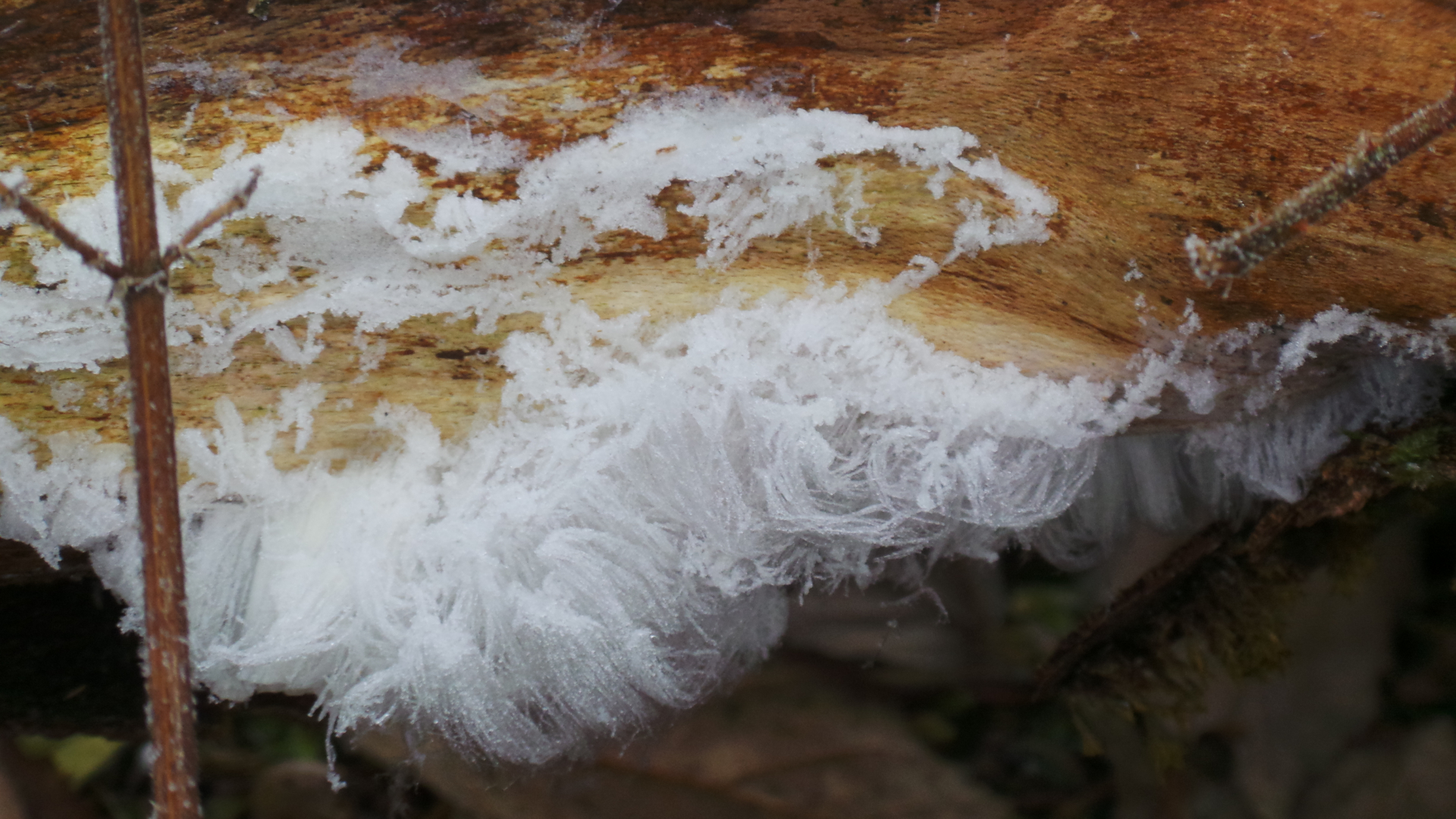 Die rosagetönte Gallertkruste (Exediopsis effusa) und ein von ihr gebildetes Protein soll bei der Entstehung des Haareises aus dem Holz heraus ihre Finger im Spiel haben: