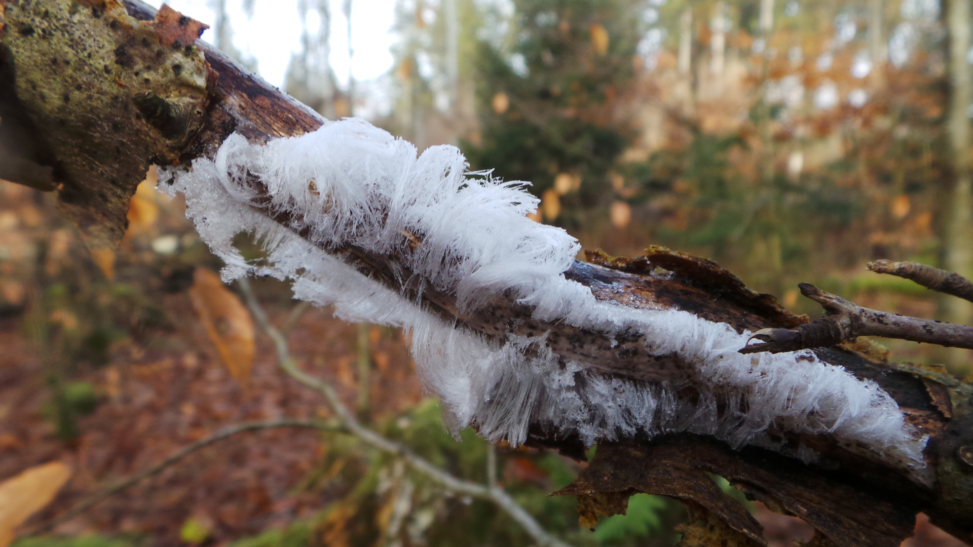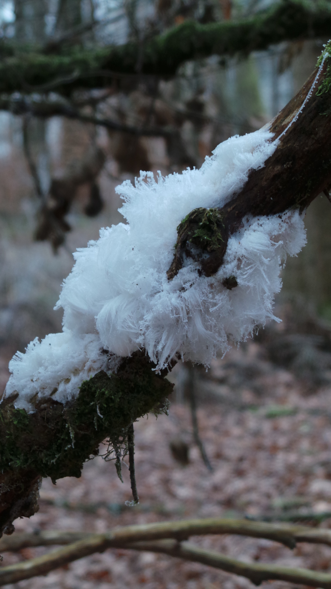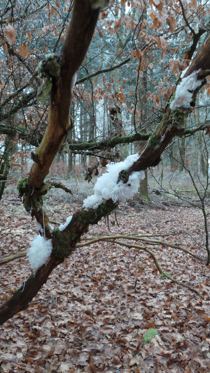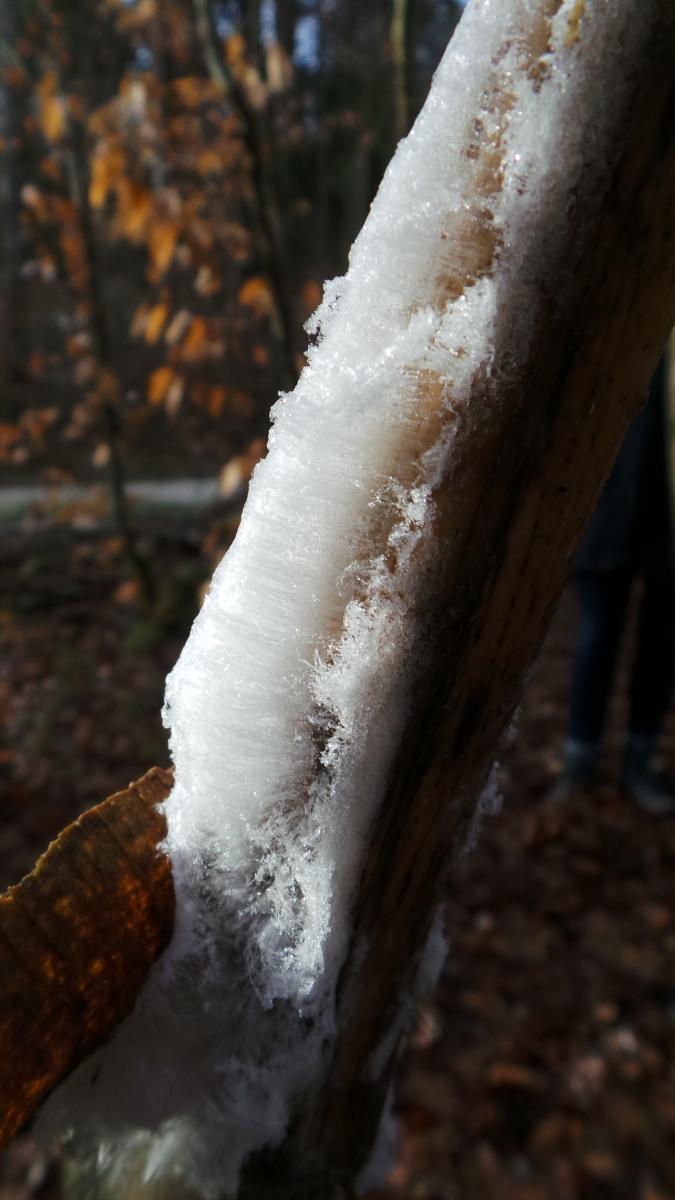 Heute morgen auf dem Marsch durch den Wald zur Weihnachtsgans auf den anderen Berg haben wir gehäuft Haareis auf Totholz gesehen. Nachts hatte es ca -1,5°C, beim Fotografieren gegen 11.00 Uhr ca 0 - 1°C.