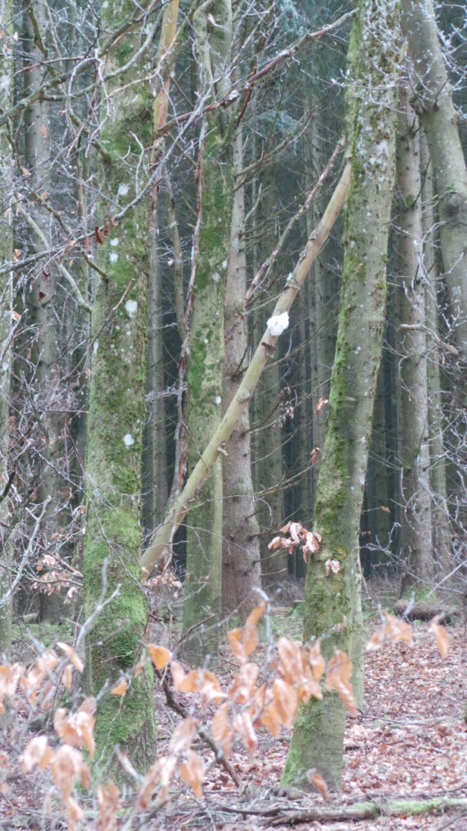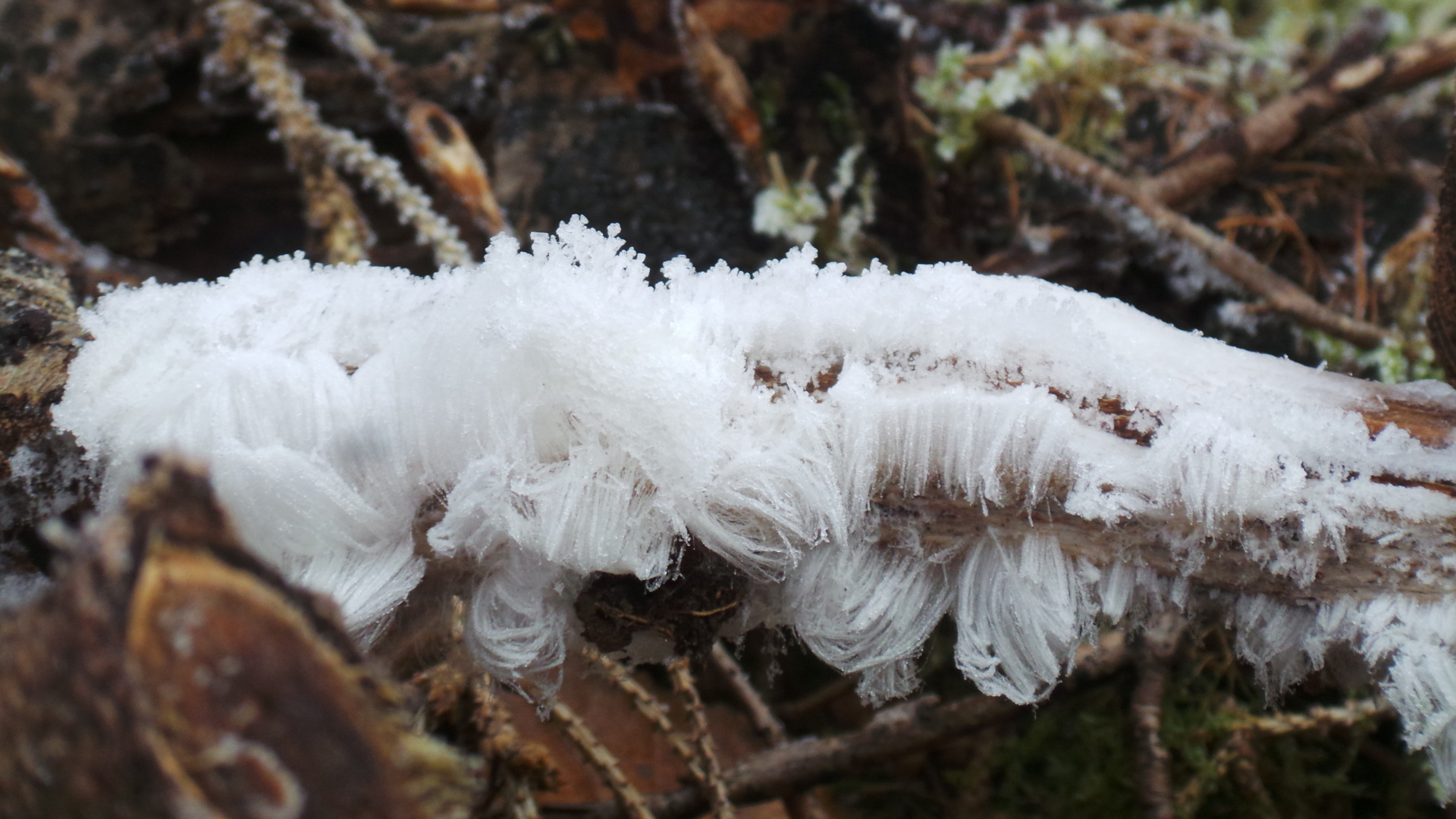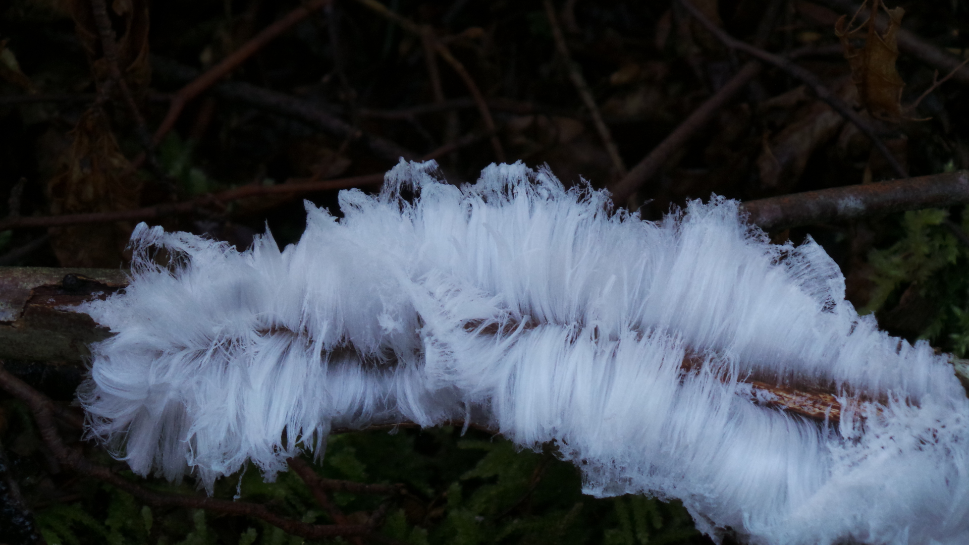 Heute morgen auf dem Marsch durch den Wald zur Weihnachtsgans auf den anderen Berg haben wir gehäuft Haareis auf Totholz gesehen. Nachts hatte es ca -1,5°C, beim Fotografieren gegen 11.00 Uhr ca 0 - 1°C.