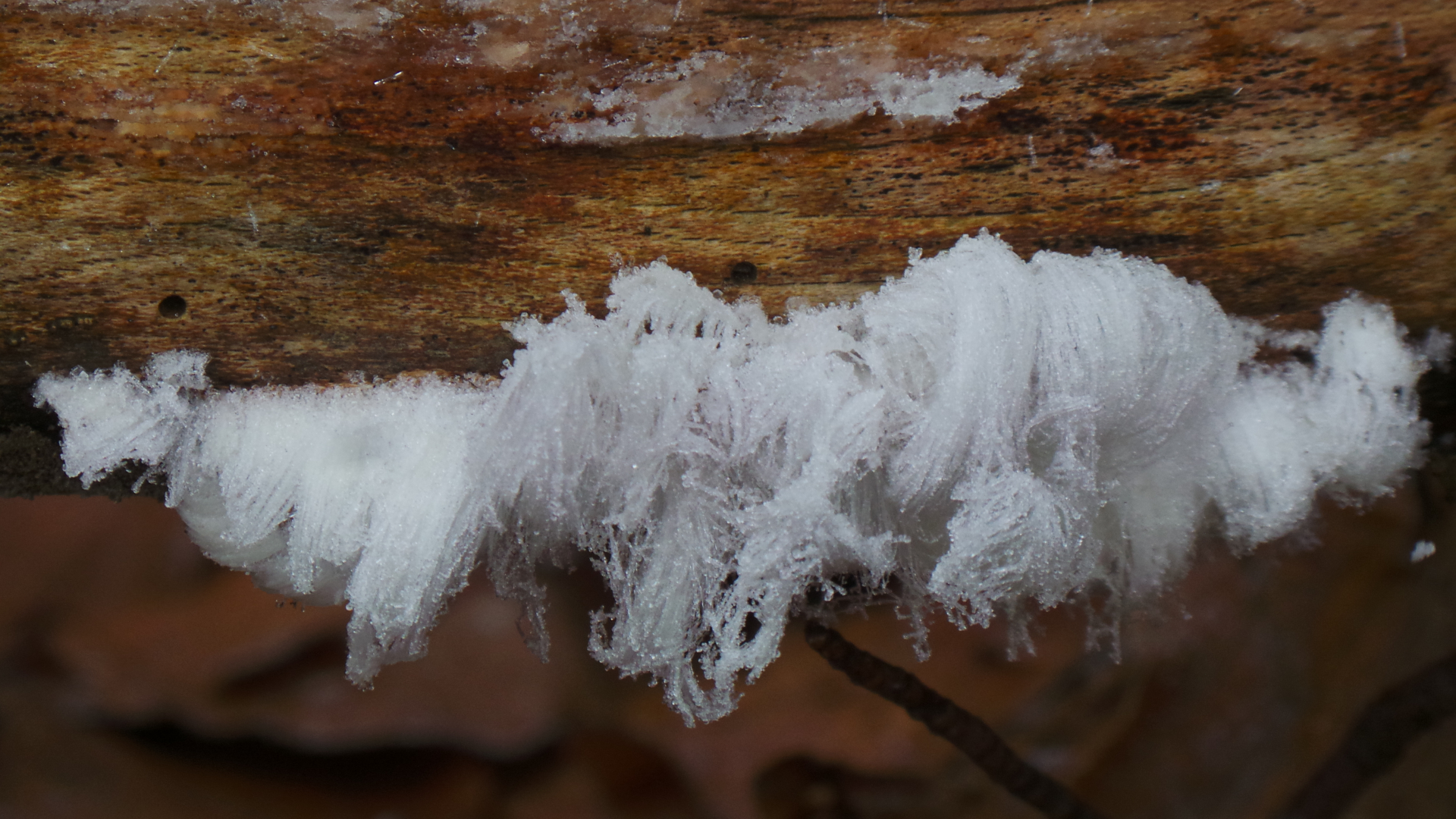 Die rosagetönte Gallertkruste (Exediopsis effusa) und ein von ihr gebildetes Protein soll bei der Entstehung des Haareises aus dem Holz heraus ihre Finger im Spiel haben:
