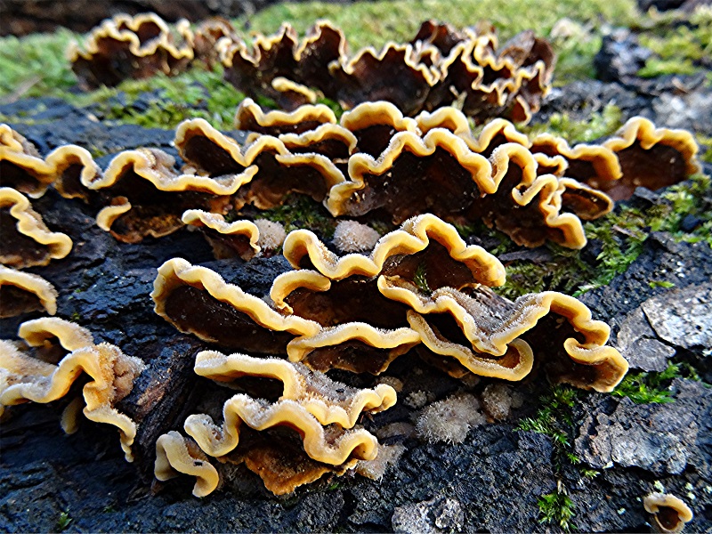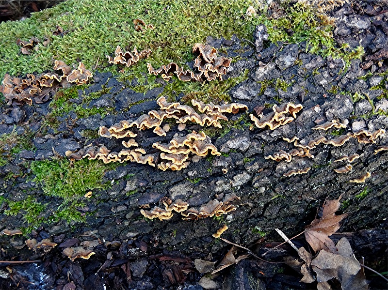 im Remstal bei Remshalden Grunbach entdeckte ich an liegenden Baumstämmen auf einer Wiese diese Pilze, von denen ich annahm, es müßten Schichtpilze sein. Ich dachte bei den Stämmen könnte es sich um Eiche handeln, aber das ist mehr als unsicher. Sicher handelt es sich um Laubholzbäume.