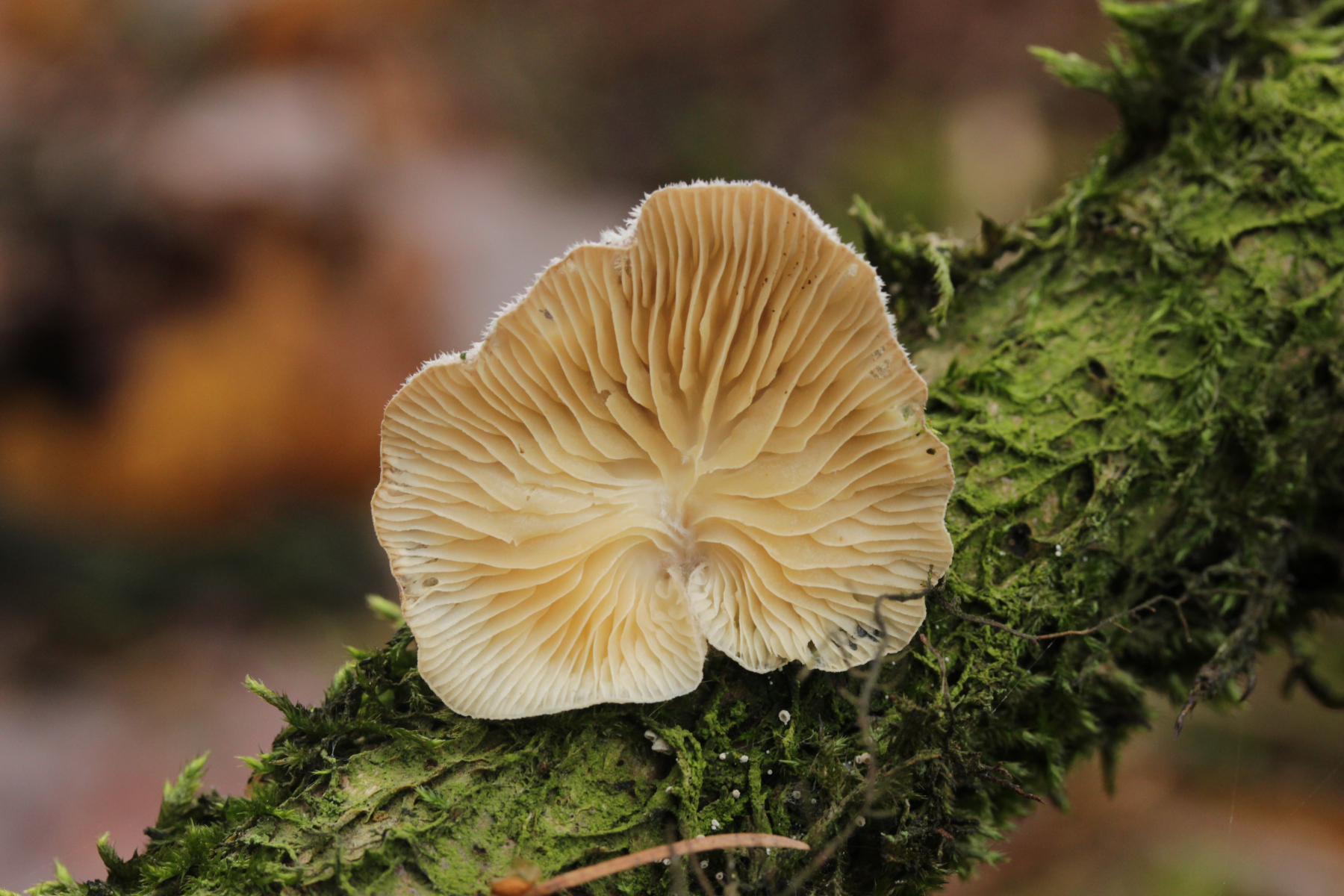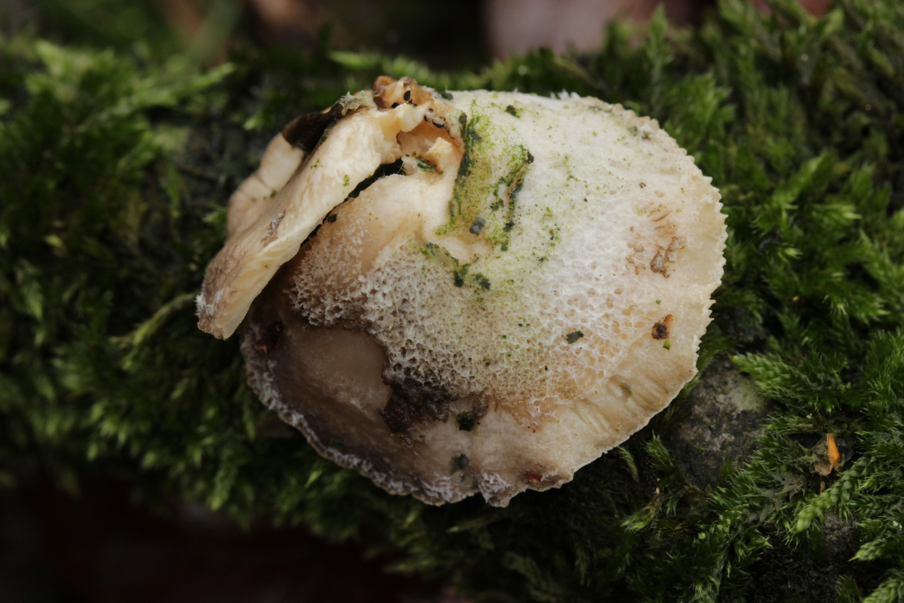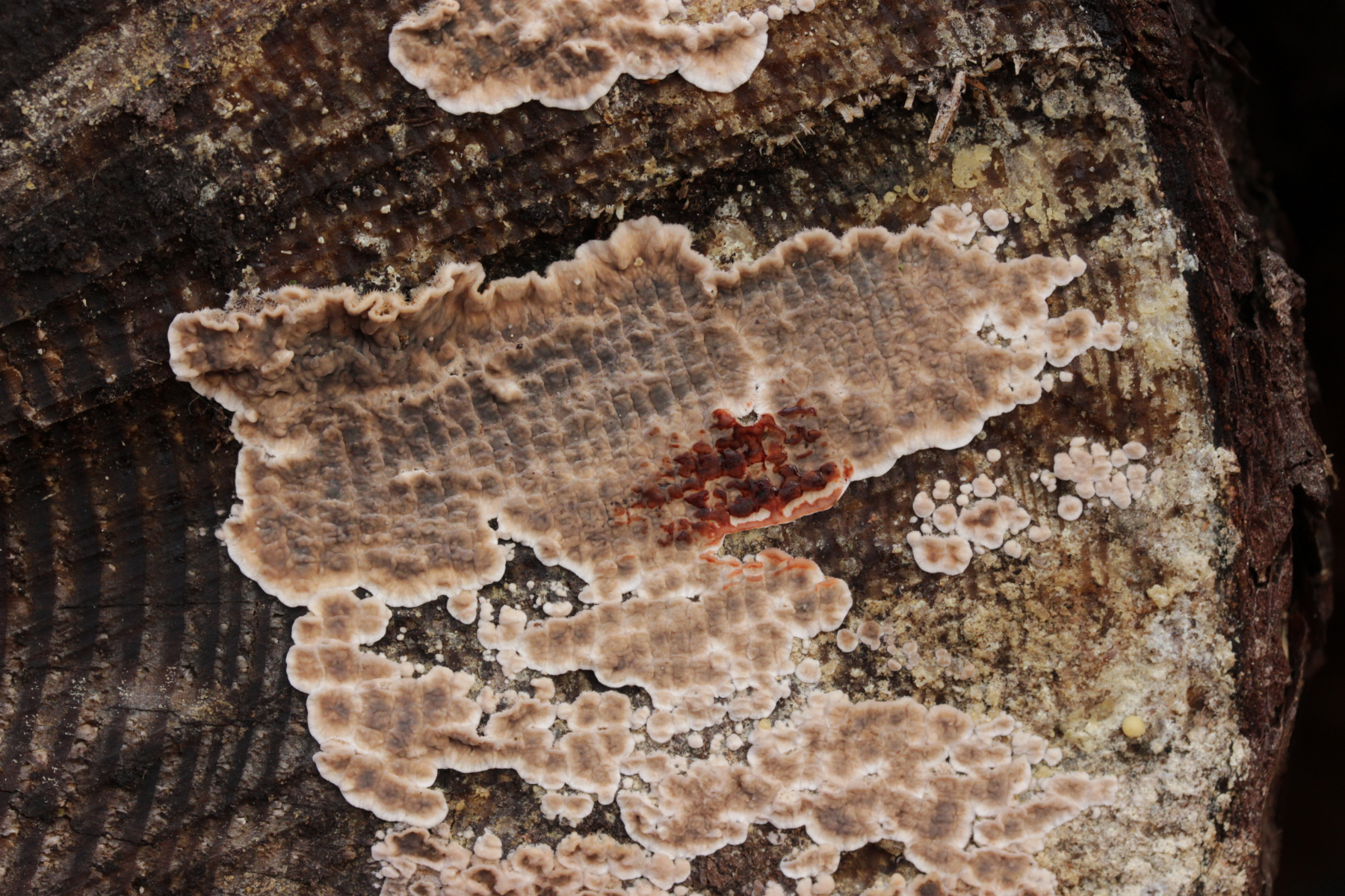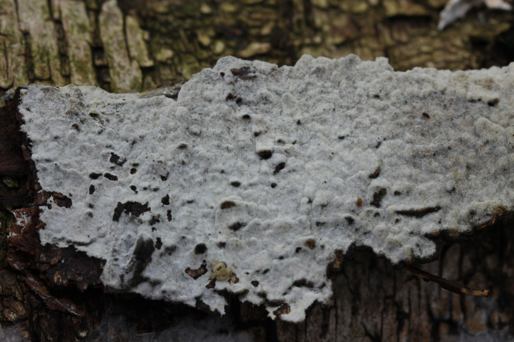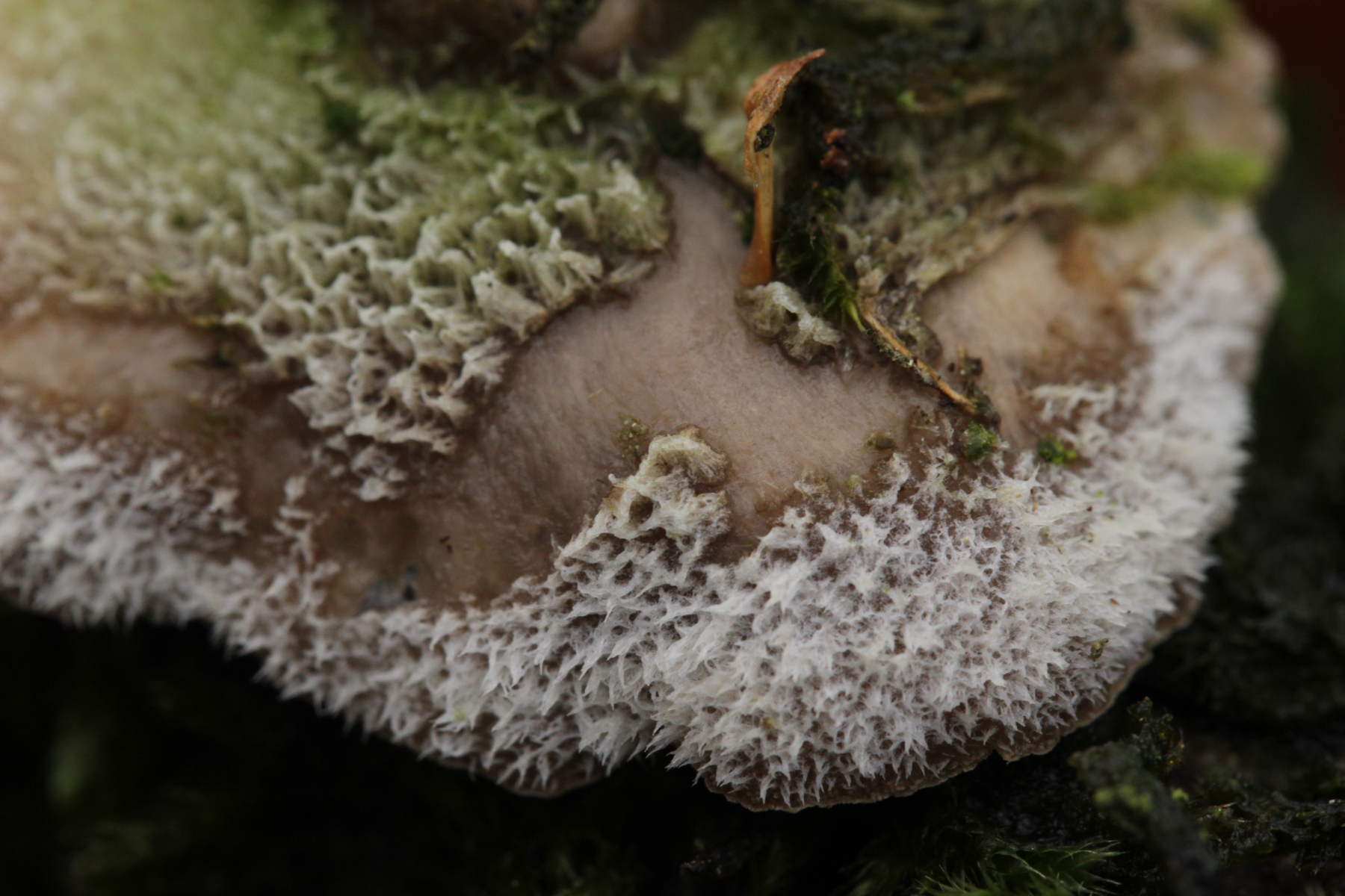 14. Hier bin ich etwas ratlos. Gefunden an Laubholz. Was mich besonders irritiert, ist, daß diese Behaarung auf der Oberseite einen leichten Grünstich wie von Algen hat. Sowas kenne ich sonst nur von Trameten, die ja durchaus länger am Baum kleben als solche zarten Fruchtkörper hier.