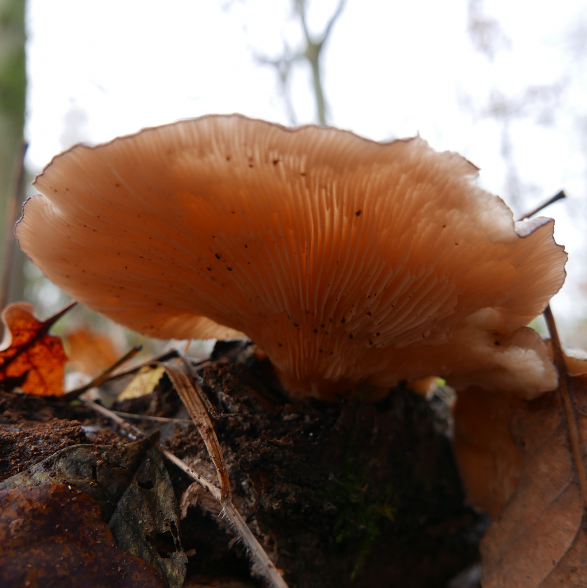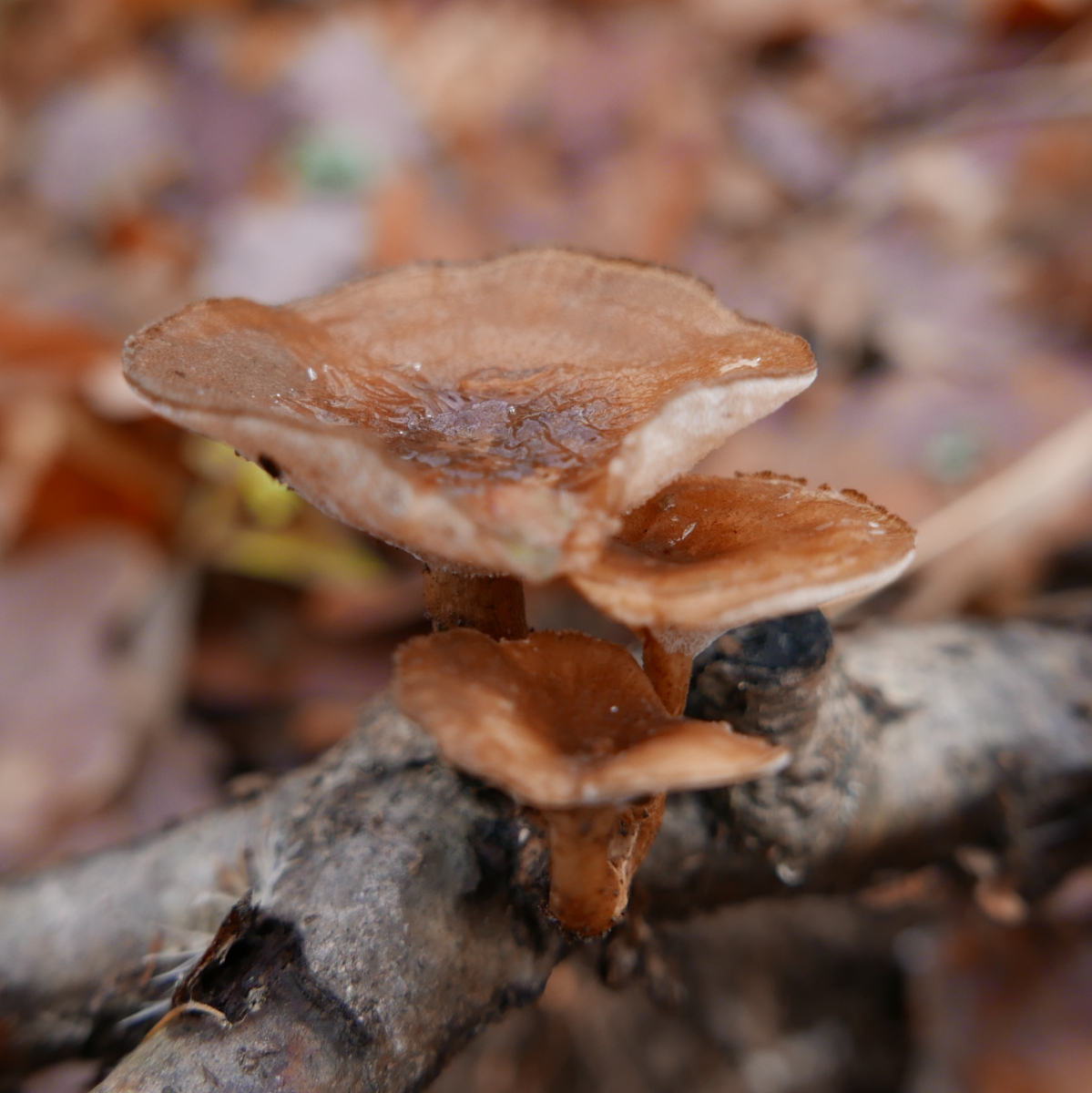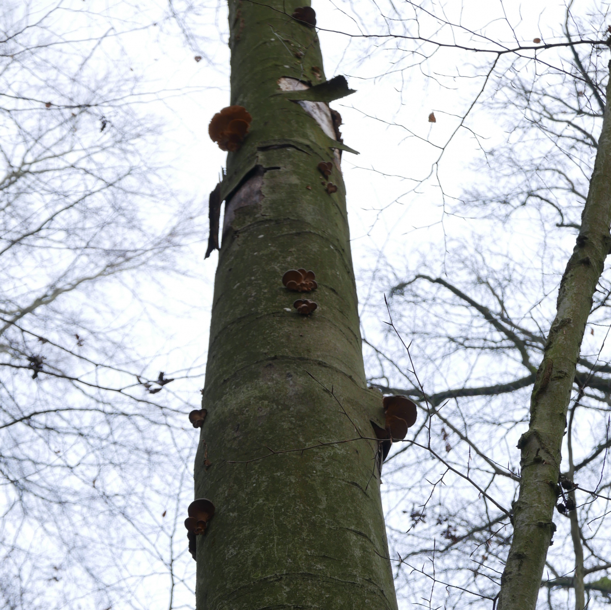 Eine angeschlagenen Buche zeigte ein paar Fruchtkörper, in unerreichbarer Höhe. Nach Fotobeweis stellten sie sich für mich allerdings als Gelbstielige Muschelseitlinge dar.
