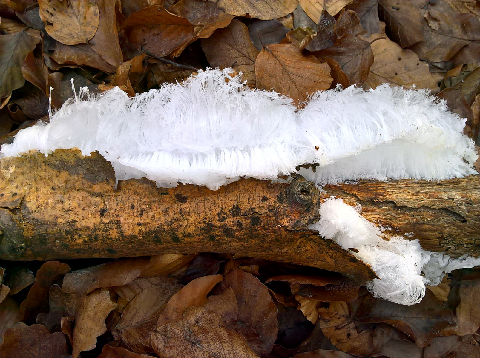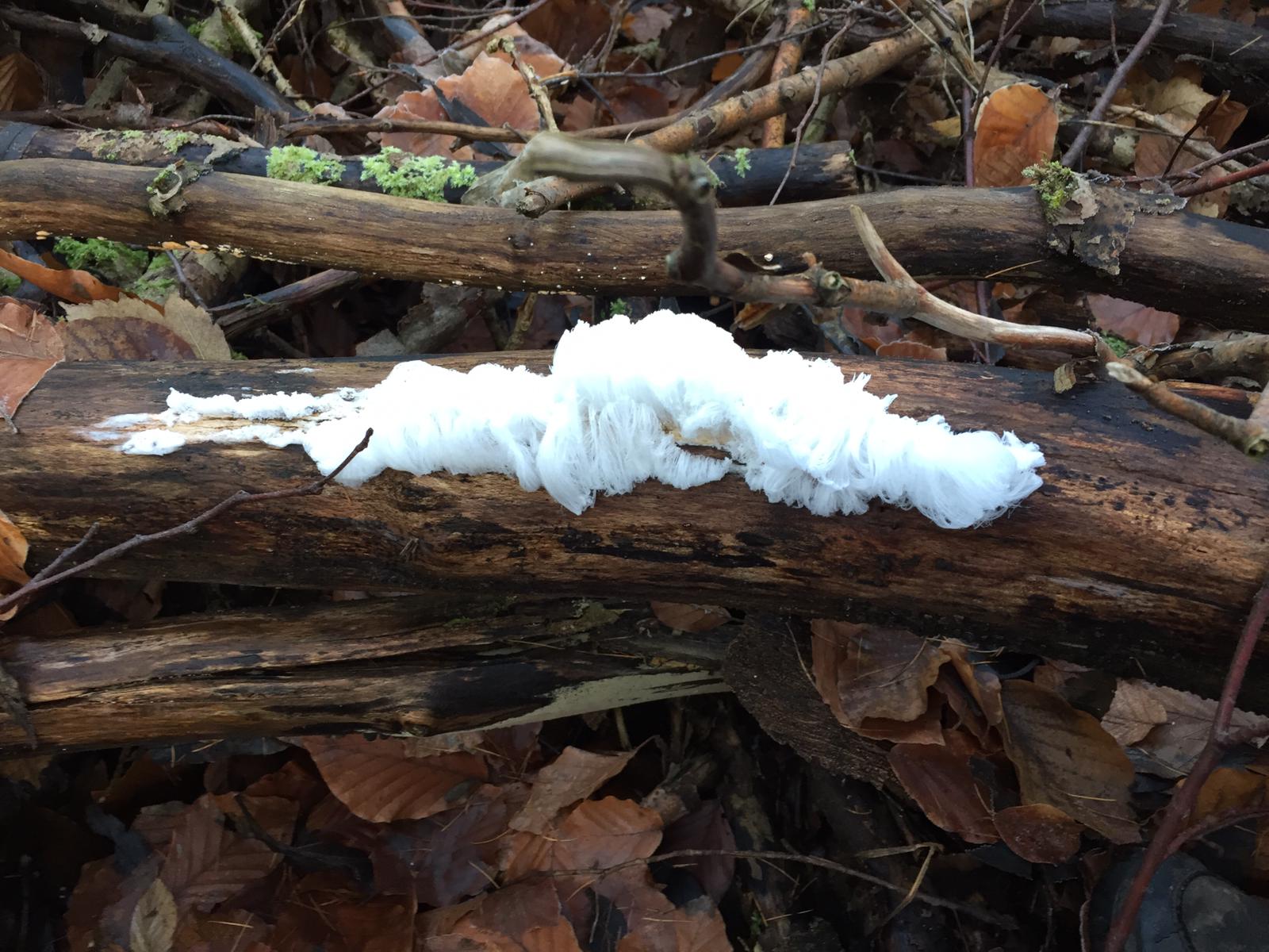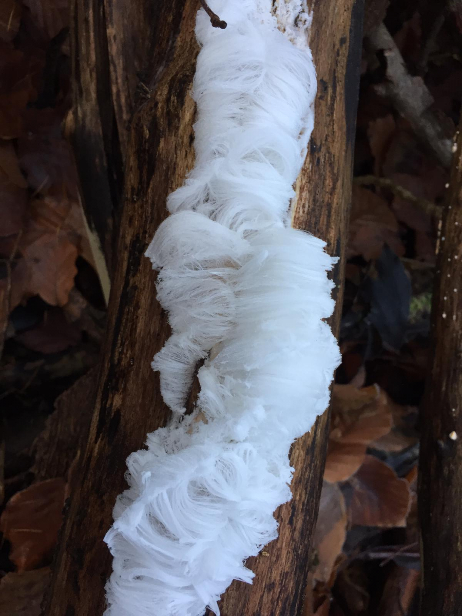 ich musste erst nach Metzingen fahren, um Haareis zu finden. In meiner Gegend wurde ich noch nie fündig. Die Temperatur spielt natürlich auch eine entscheidende Rolle, so um die 0 bis -1 Grad ist sehr förderlich. In der Nähe eines Haareises fand ich einen rosa Rindenpilz, möglich, dass der der besagte Pilz ist, der für die Entstehung von Haareis mit verantwortlich sein soll.