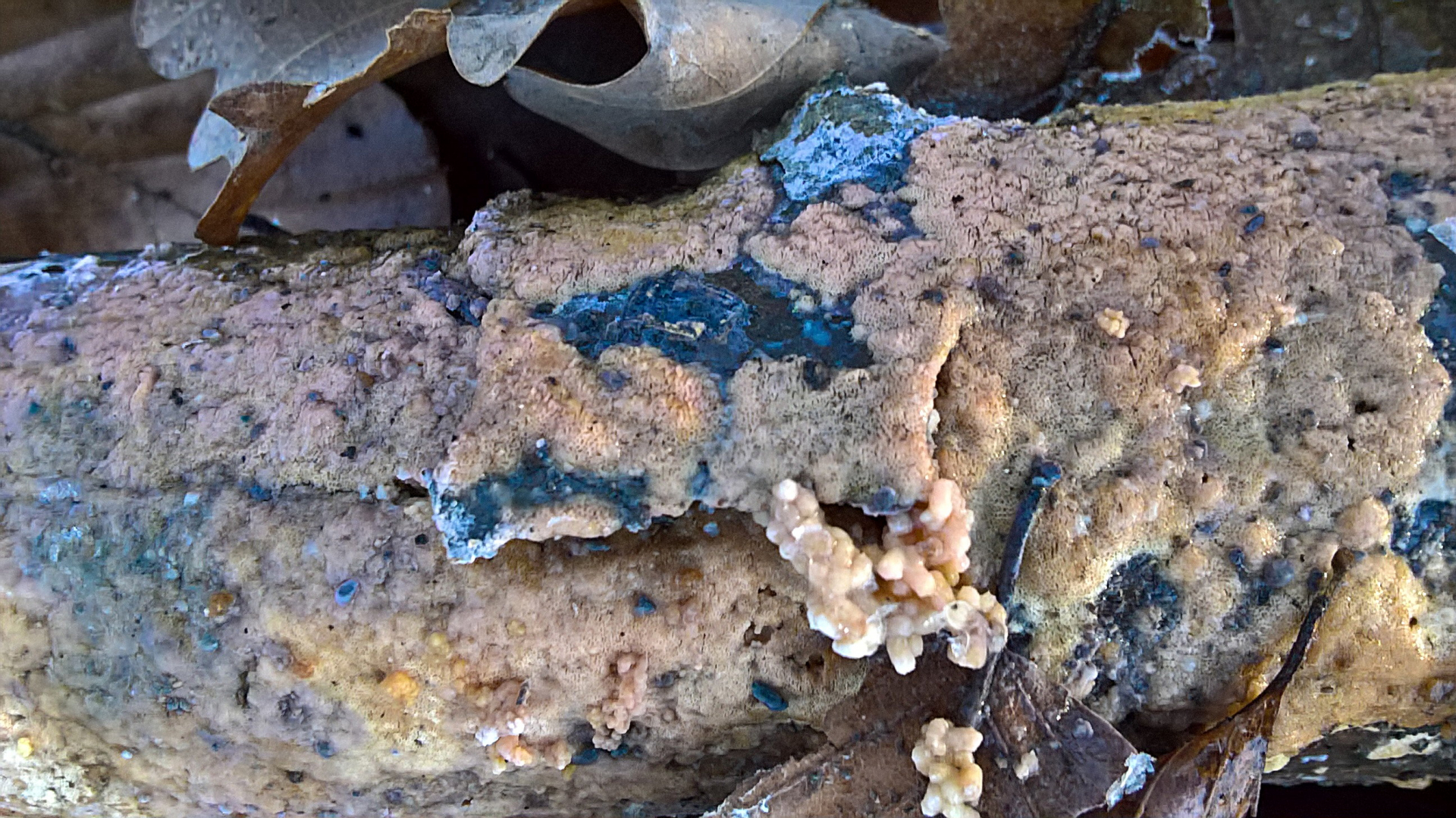 Da sind auf jeden Fall zerfallende Fruchtkörper eines resupinaten Porlings, aber auch (vermutlich zwei) verschiedene Rindenpilze, die sich teils gegenseitig überwachsen. Auf dem letzten Bild ist unten links ein größerer zusammenhängender Fruchtkörper, der theoretisch eine Exidiopsis sein könnte, aber vermutlich nicht effusa (Fruchtkörper zu weiß). Weiter oben und weiter mittig ist aber noch ein Rindenpilz, der eher einen rosa Farbton hat, das könnte dann auch Exidiopsis effusa sein, aber Pilze mit dem Aussehen gibt es haufenweise, also ohne Mikromerkmale leider nicht bestimmbar.
