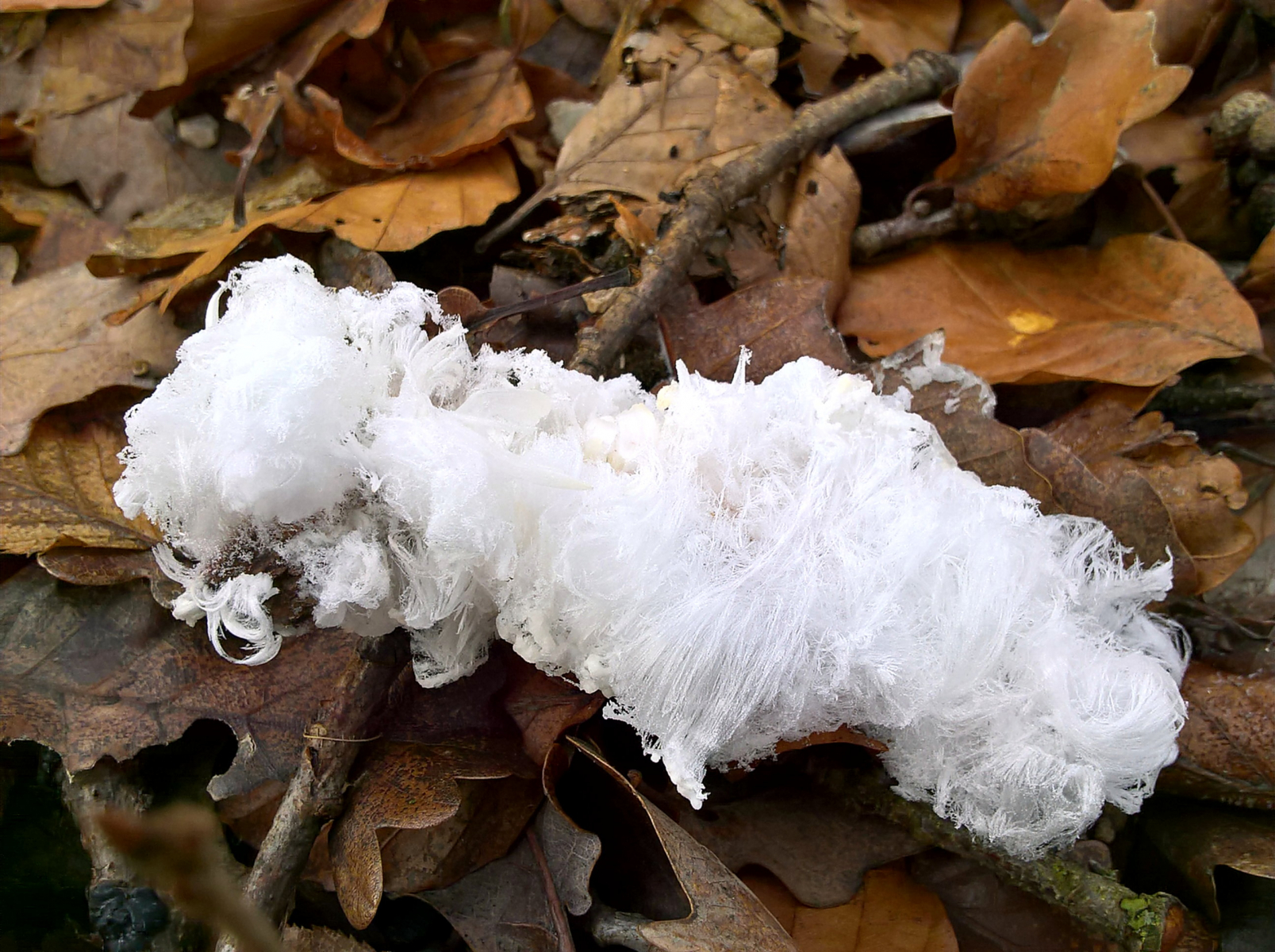 ich musste erst nach Metzingen fahren, um Haareis zu finden. In meiner Gegend wurde ich noch nie fündig. Die Temperatur spielt natürlich auch eine entscheidende Rolle, so um die 0 bis -1 Grad ist sehr förderlich. In der Nähe eines Haareises fand ich einen rosa Rindenpilz, möglich, dass der der besagte Pilz ist, der für die Entstehung von Haareis mit verantwortlich sein soll.