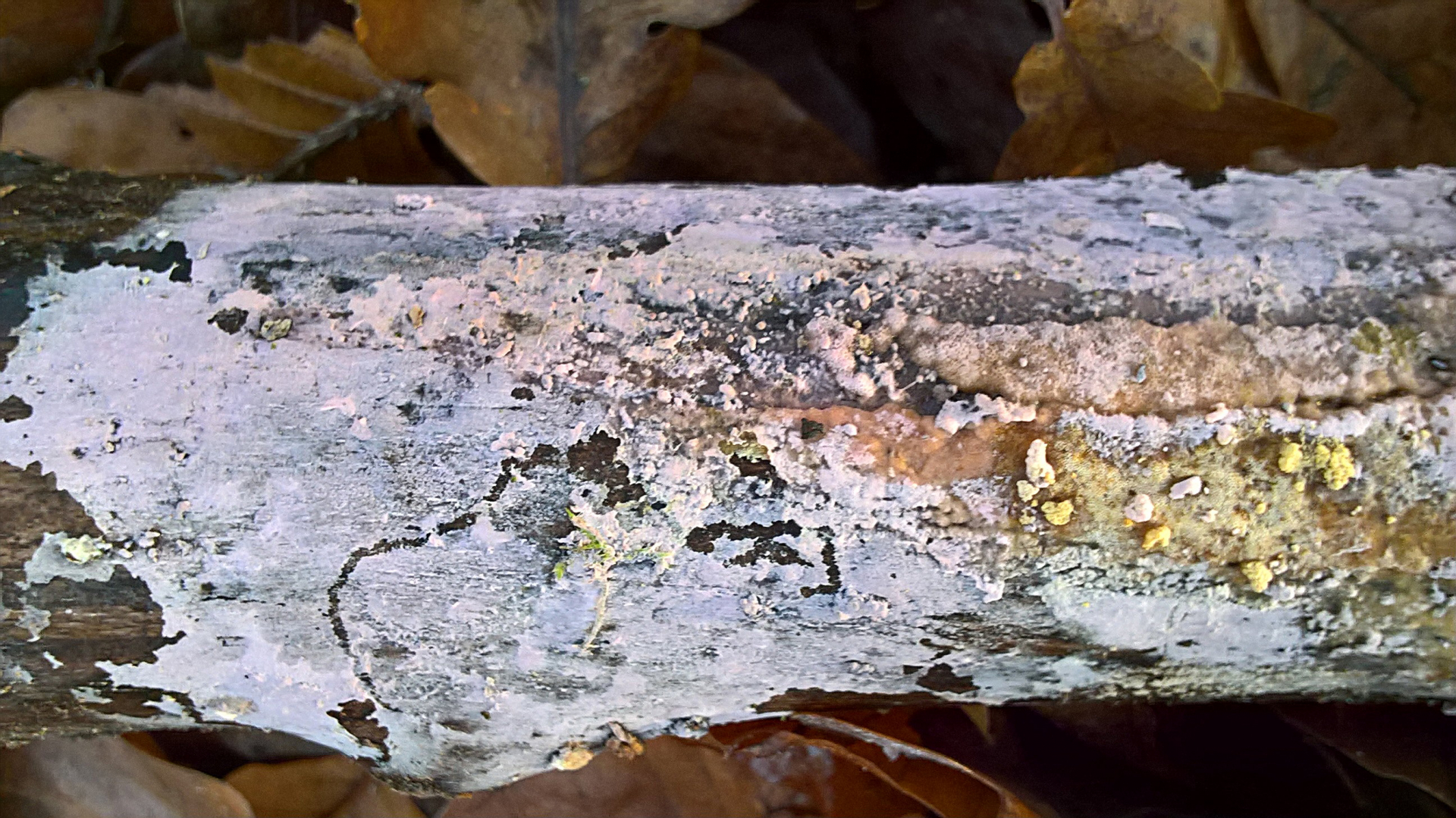 Da sind auf jeden Fall zerfallende Fruchtkörper eines resupinaten Porlings, aber auch (vermutlich zwei) verschiedene Rindenpilze, die sich teils gegenseitig überwachsen. Auf dem letzten Bild ist unten links ein größerer zusammenhängender Fruchtkörper, der theoretisch eine Exidiopsis sein könnte, aber vermutlich nicht effusa (Fruchtkörper zu weiß). Weiter oben und weiter mittig ist aber noch ein Rindenpilz, der eher einen rosa Farbton hat, das könnte dann auch Exidiopsis effusa sein, aber Pilze mit dem Aussehen gibt es haufenweise, also ohne Mikromerkmale leider nicht bestimmbar.