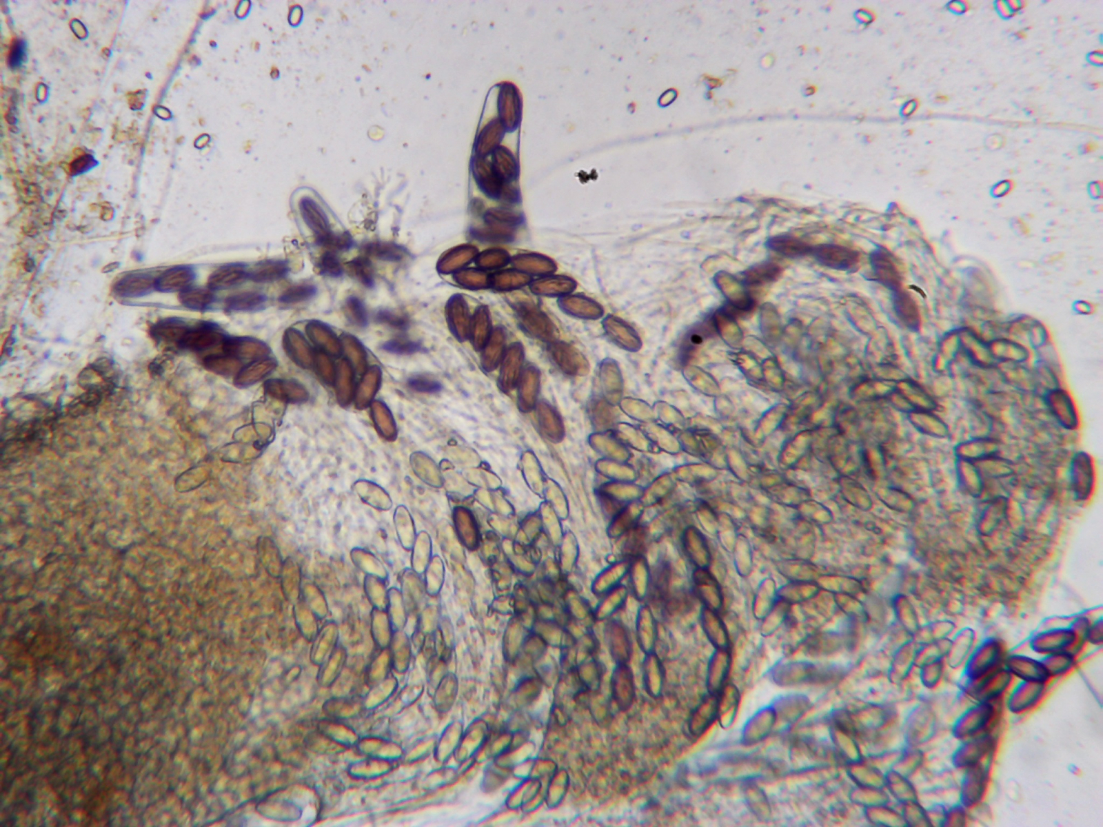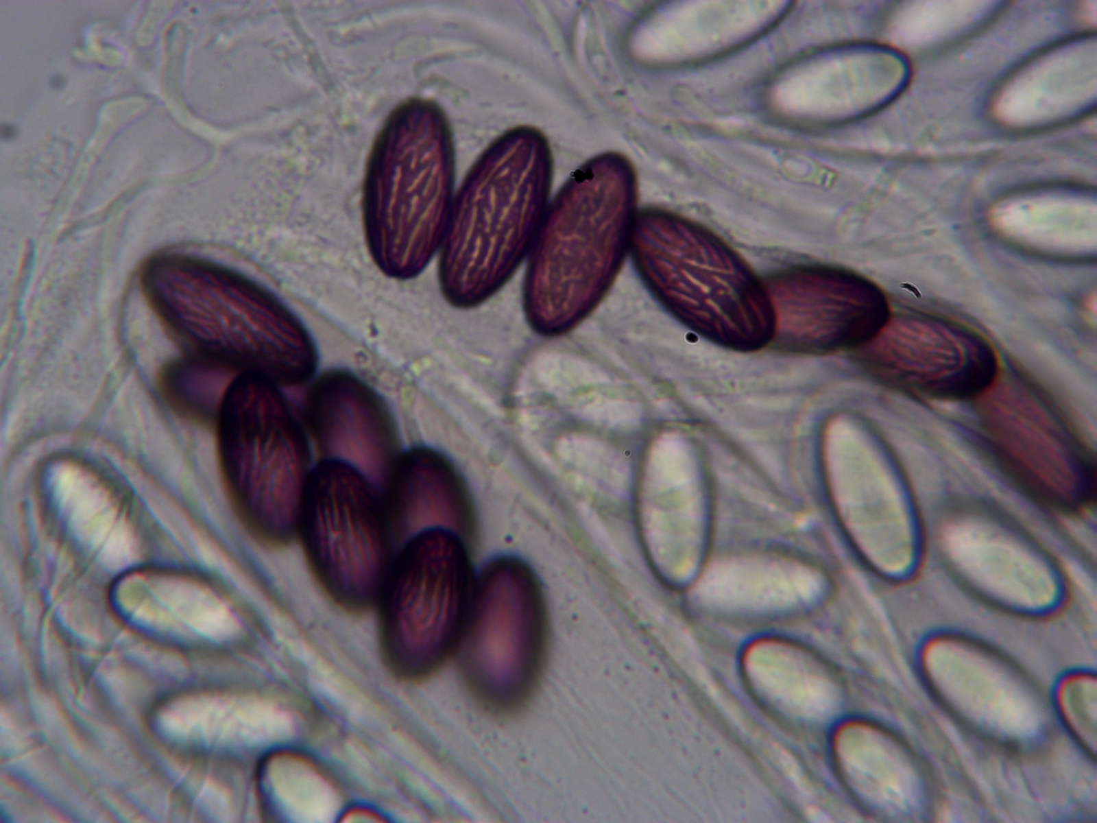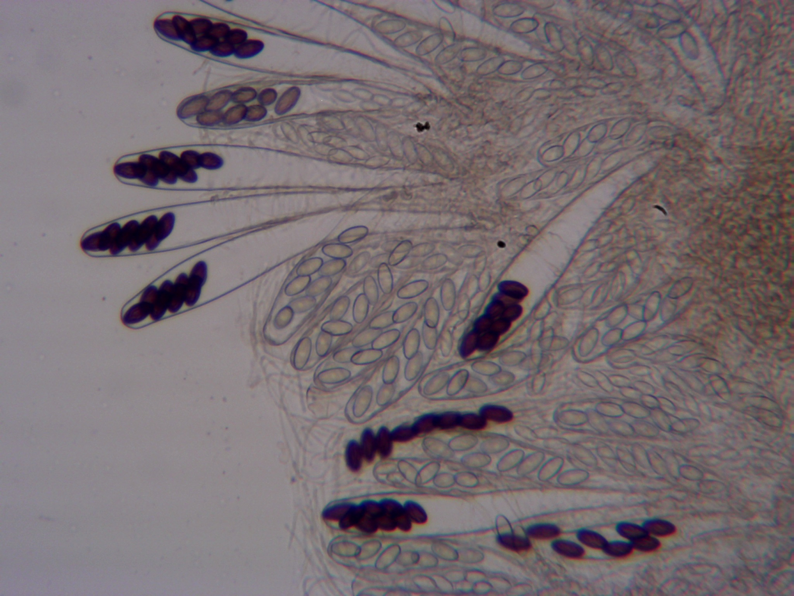 klein (kaum 1 mm) mit nur wenigen Asci, gelblich-weißlich. Sporen (22-)25-26(-30) µm, mit anastomosierenden erhabenen Linien.