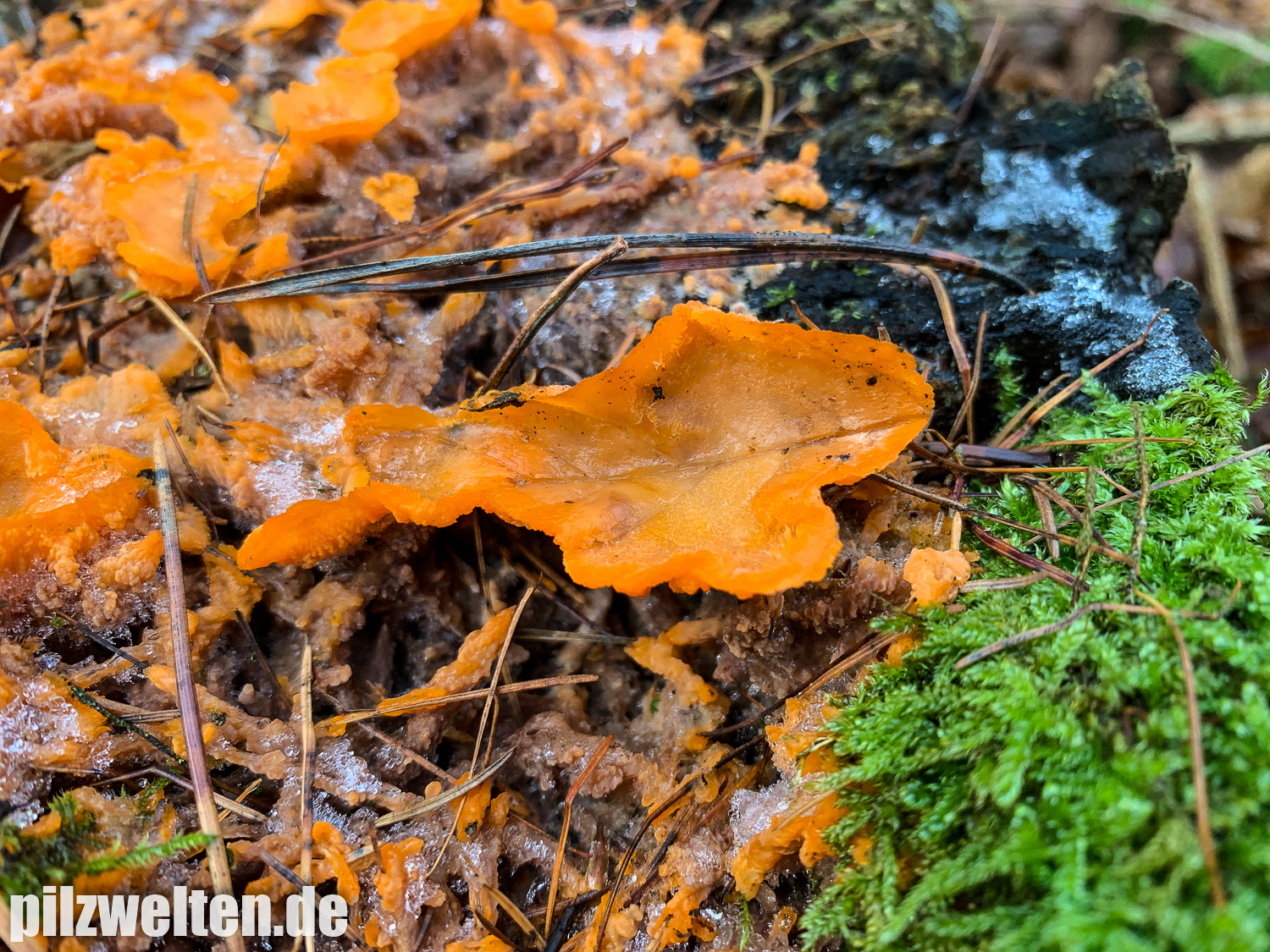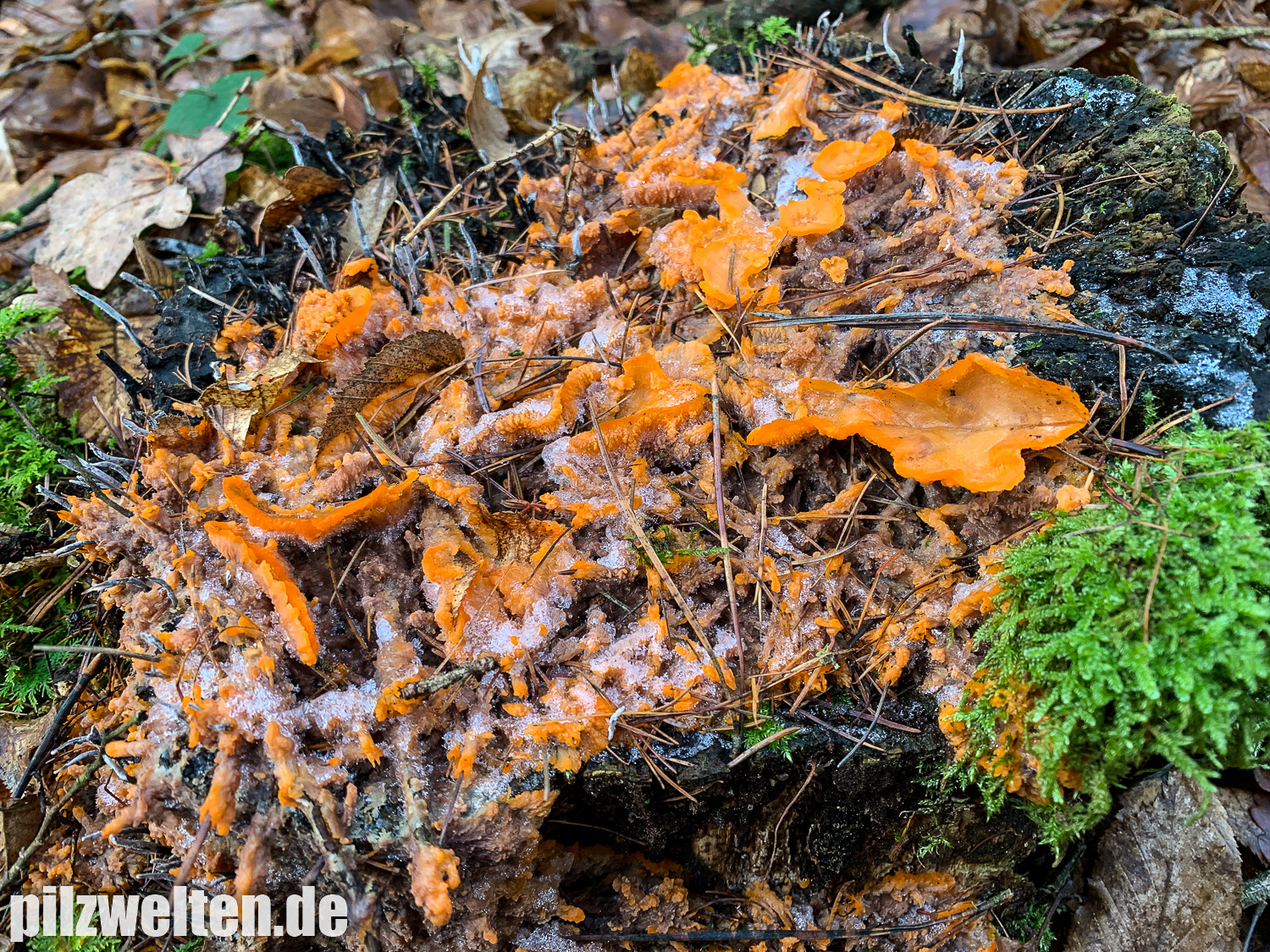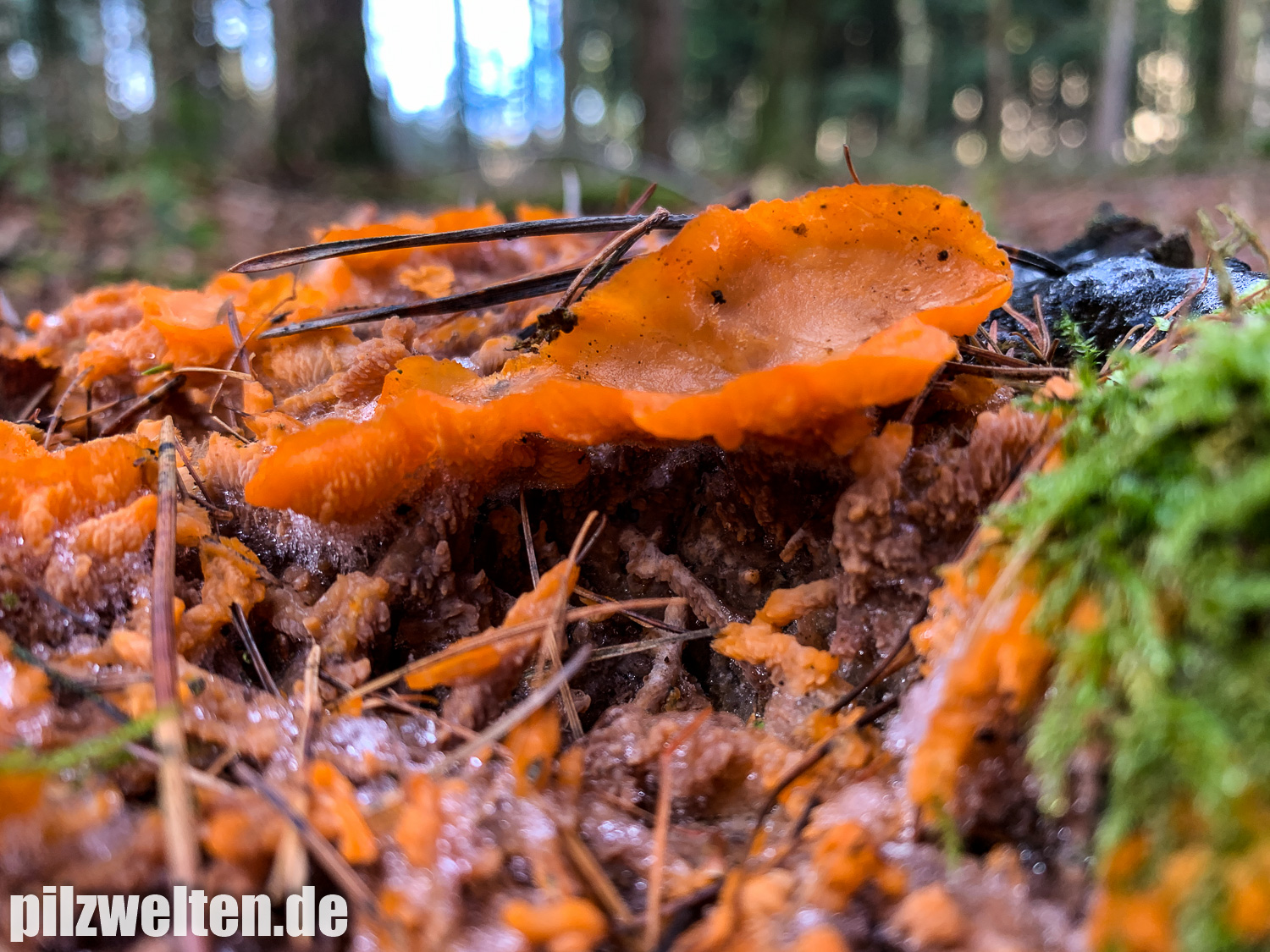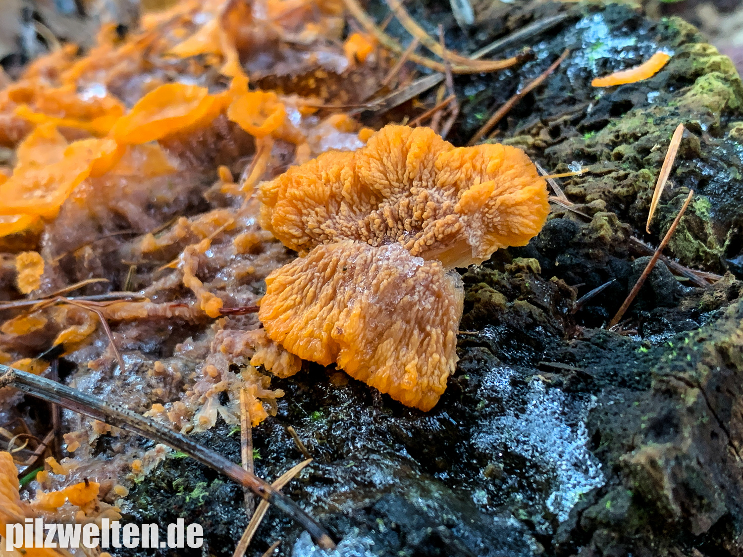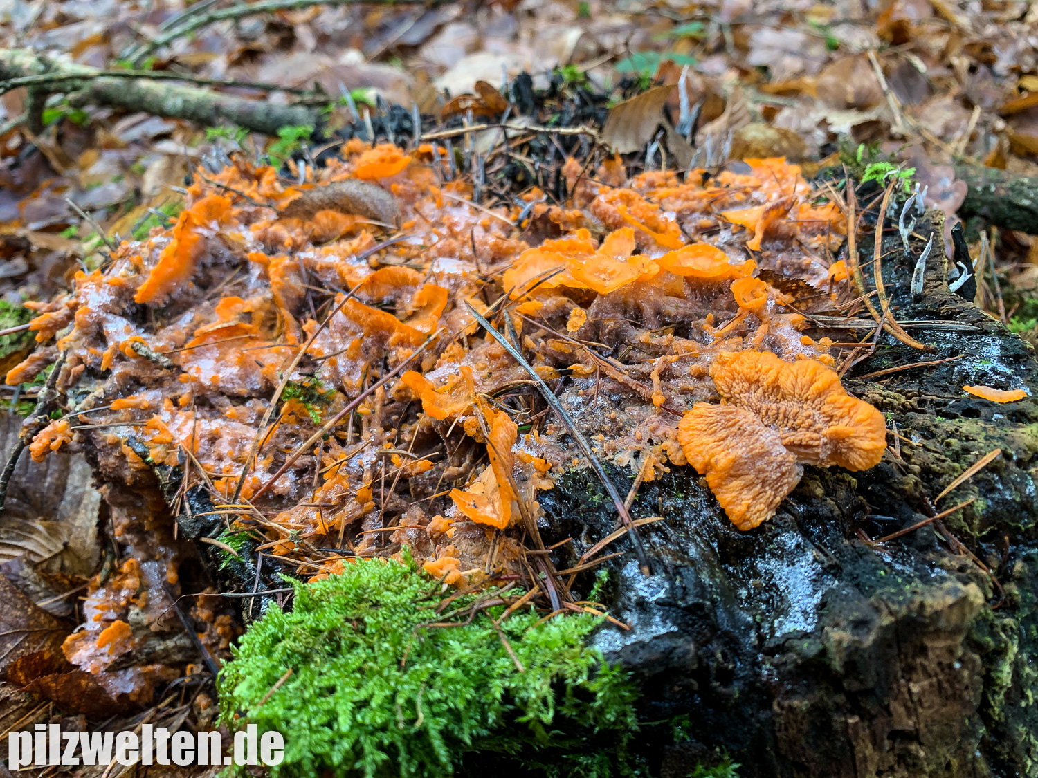 Auf unserer heutigen Pilztour konnten wir einen wirklich knallorangen (vermutlich) Schleimpilz finden, der einen kompletten Baumstumpf für sich eingenommenb hatte und einige darauf liegenden Blätter komplett bzw. einige Blätter auch erst halb überzogen hatte. Hat irgendjemand eine Idee um welche Art es sich handeln könnte? Wir konnten auf die Schnelle keinen vergleichbaren Schleimpilz finden, der so groß wird und so leuchtend orange gefärbt ist. Hat jemand anhand der Bilder eine Idee?