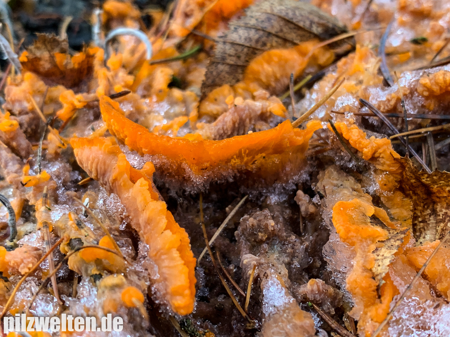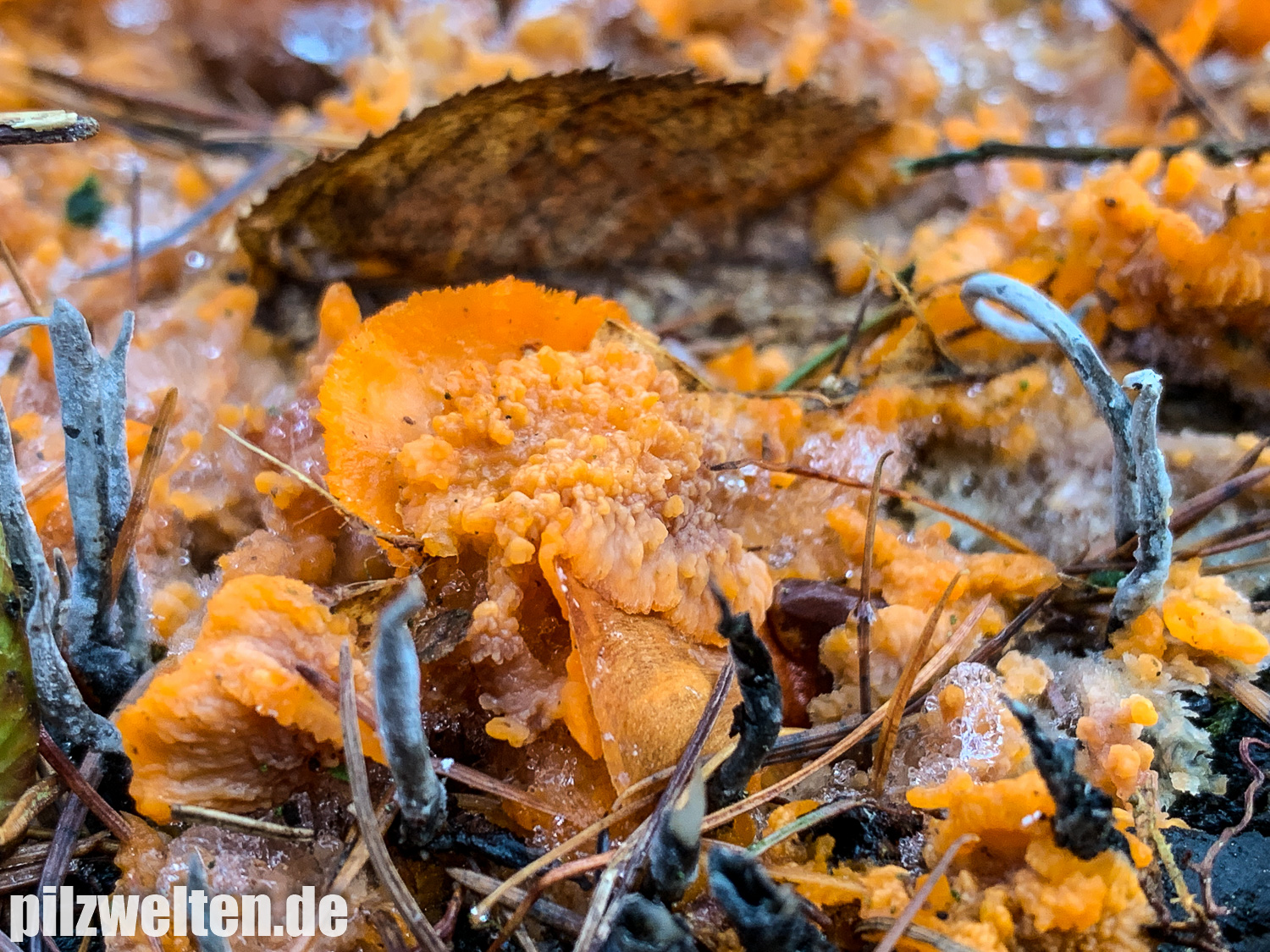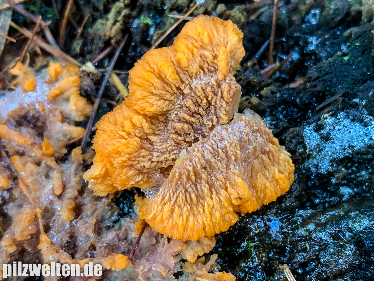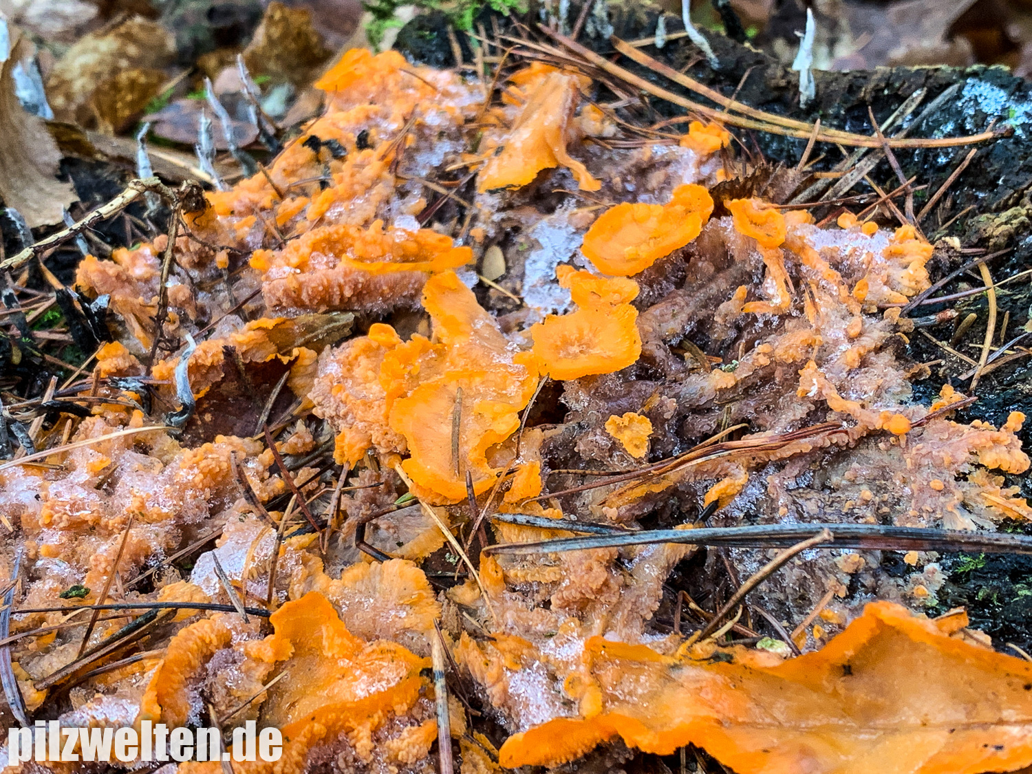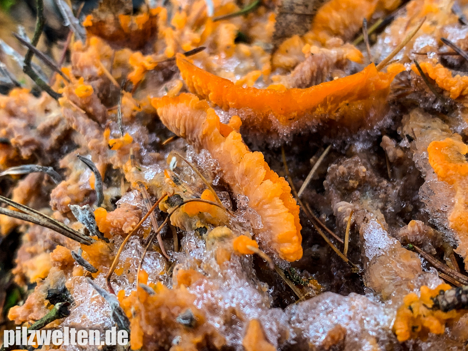 Auf unserer heutigen Pilztour konnten wir einen wirklich knallorangen (vermutlich) Schleimpilz finden, der einen kompletten Baumstumpf für sich eingenommenb hatte und einige darauf liegenden Blätter komplett bzw. einige Blätter auch erst halb überzogen hatte. Hat irgendjemand eine Idee um welche Art es sich handeln könnte? Wir konnten auf die Schnelle keinen vergleichbaren Schleimpilz finden, der so groß wird und so leuchtend orange gefärbt ist. Hat jemand anhand der Bilder eine Idee?