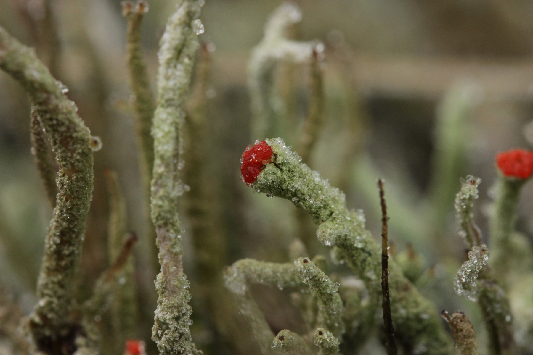 10. Cladonia sp. Als ich auf dem Boden kniete um die Flechten zu fotografieren, kamen zwei ältere Frauen vorbei und fragten, was ich da fotografieren würde. Ich verwies auf die Flechten und war sehr erstaunt, als die beiden mir sagten, dafür würden sie sich auch interessieren. Sie hatten die rotfrüchtigen Cladonien aber nicht gefunden und waren ganz entzückt, als ich sie ihnen zeigen konnte.