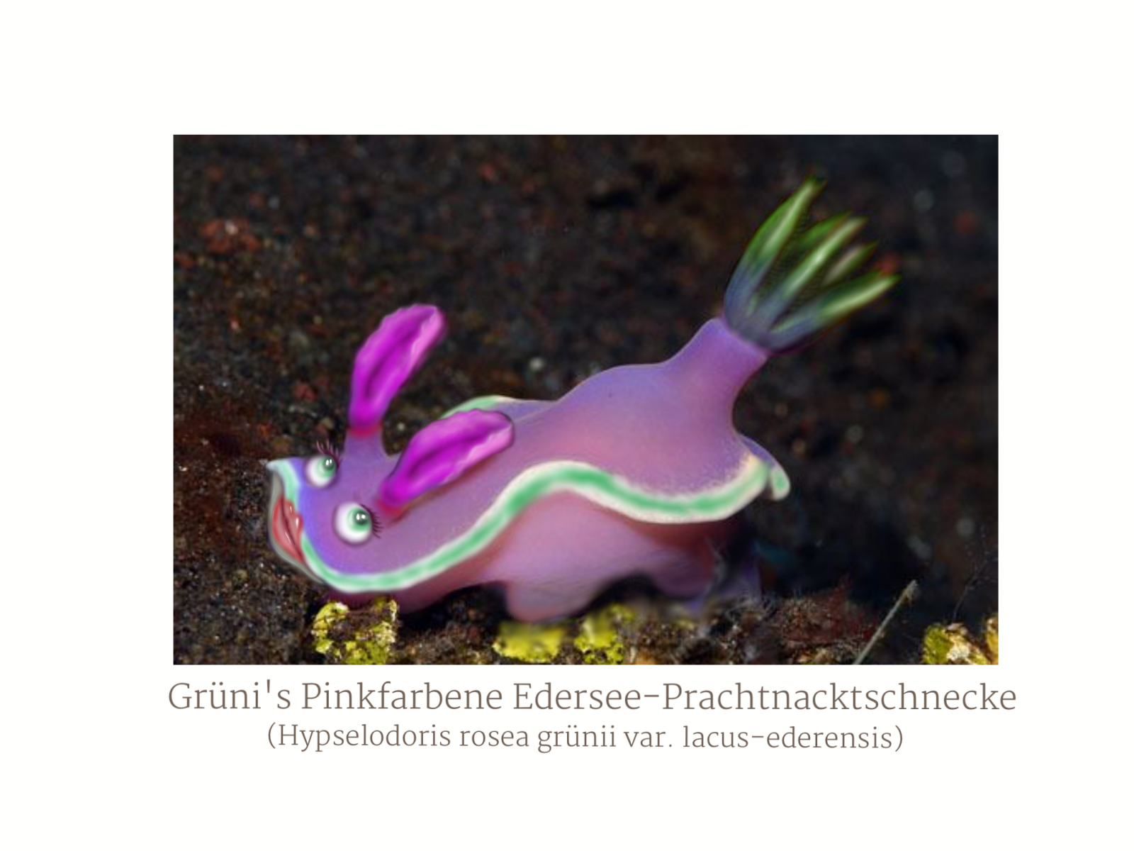 Übrigens habe ich jetzt ein recht gutes Foto von Grüni's Pinkfarbener Edersee-Prachtnacktschnecke (Hypselodoris rosea grünii var. lacus-ederensis) entwickeln können. In Teilen ist es leider ein wenig unscharf.