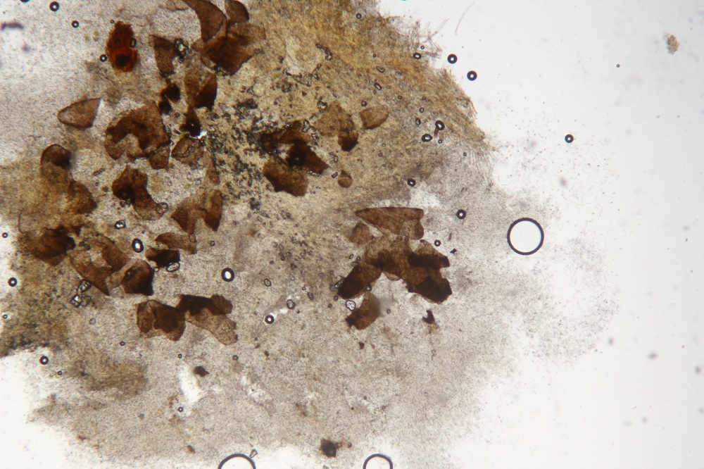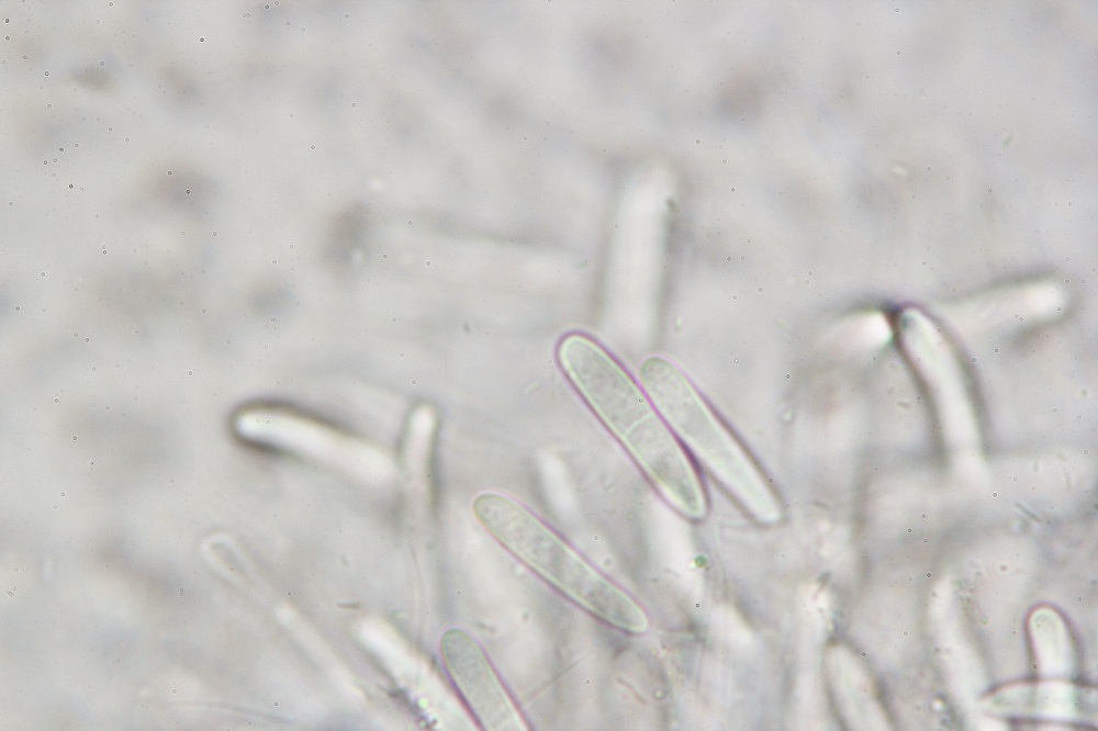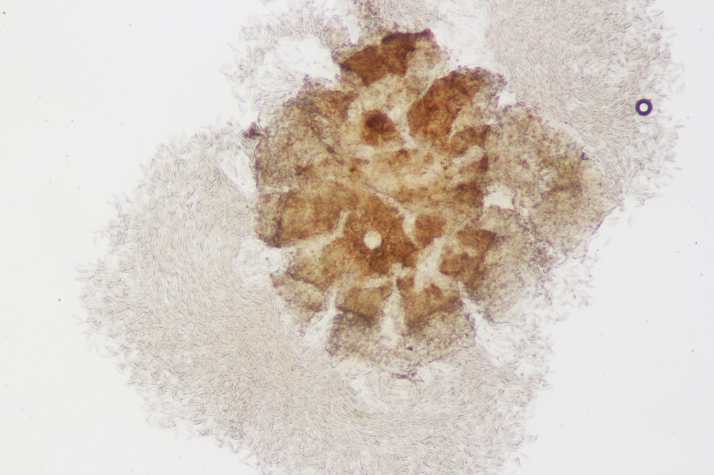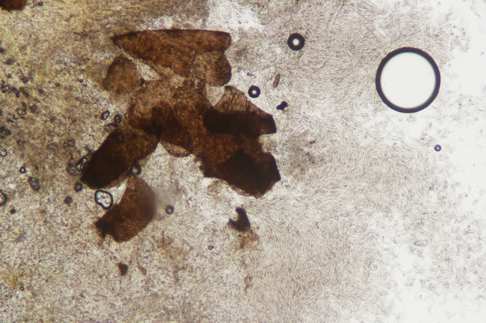 Unter dem Mikroskop gab es dann eine riesige Überraschung, denn es gab keine Asco (die fand ich im späteren Verlauf), sondern schwarze Pyknidien mit vielen Konidien.