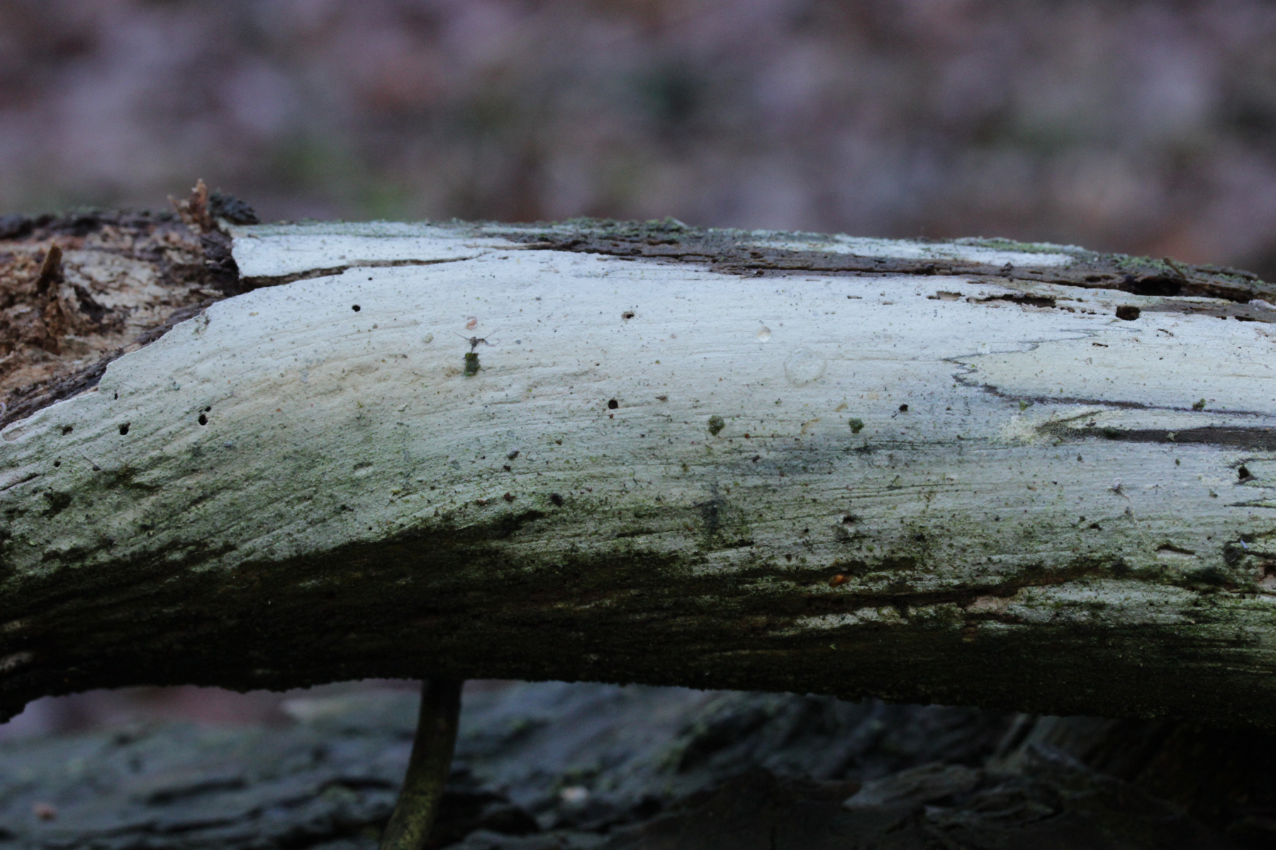 Interessant ist, daß der Pilz auch auf der Rückseite des Rindenstücks wuchs und dort nicht so eine glatte Schicht bildete, sondern eher kleine Knubbel.