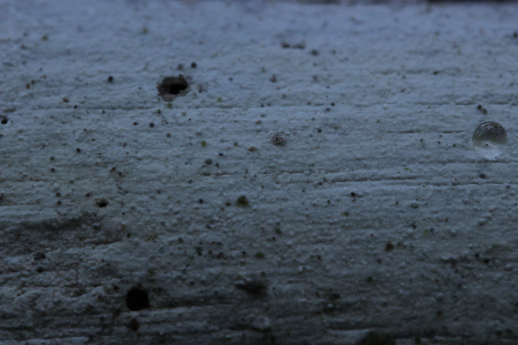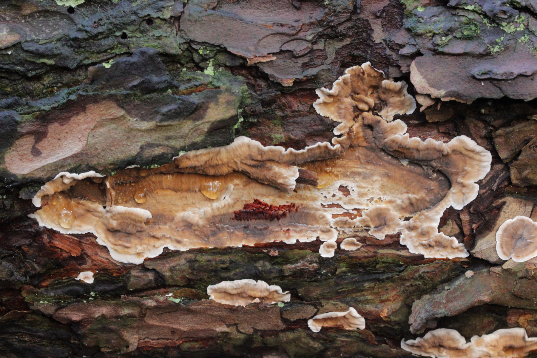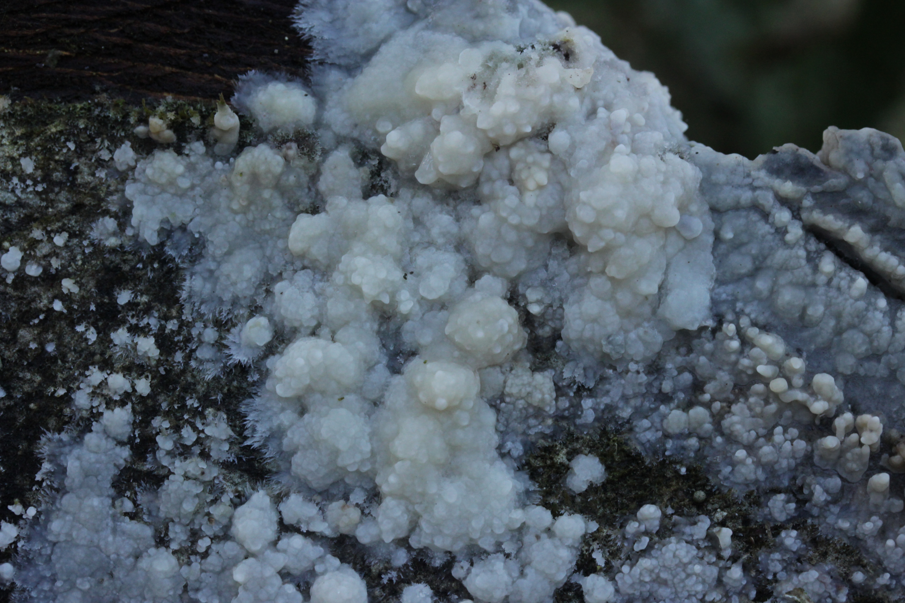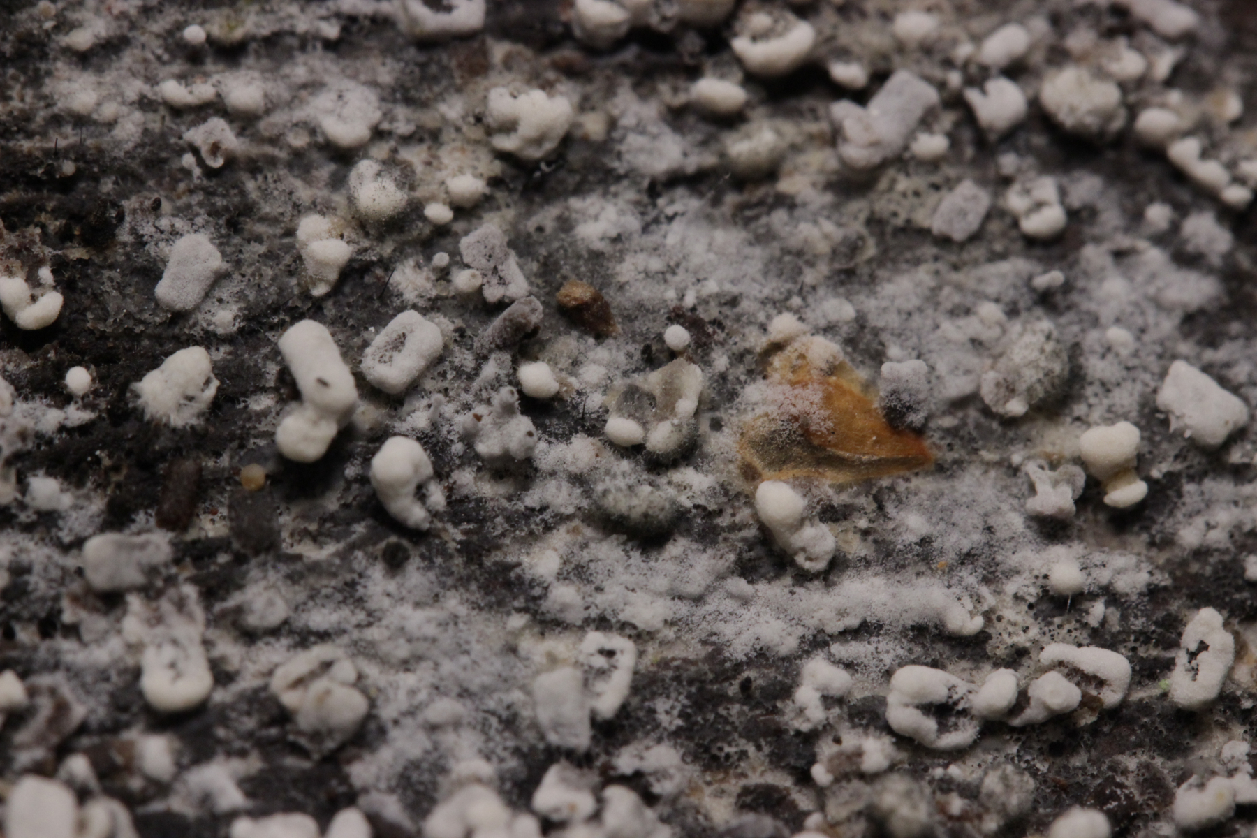 Interessant ist, daß der Pilz auch auf der Rückseite des Rindenstücks wuchs und dort nicht so eine glatte Schicht bildete, sondern eher kleine Knubbel.