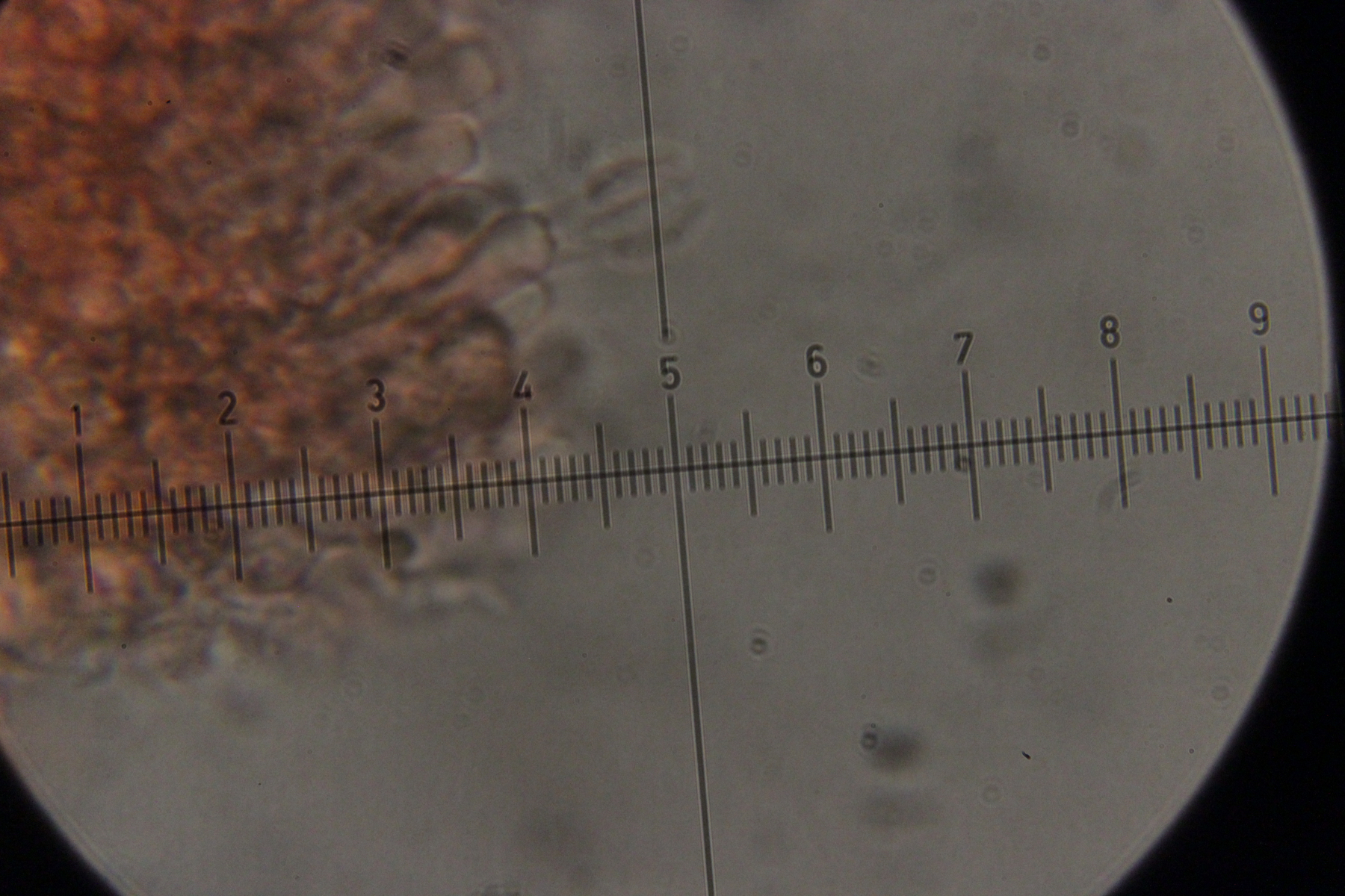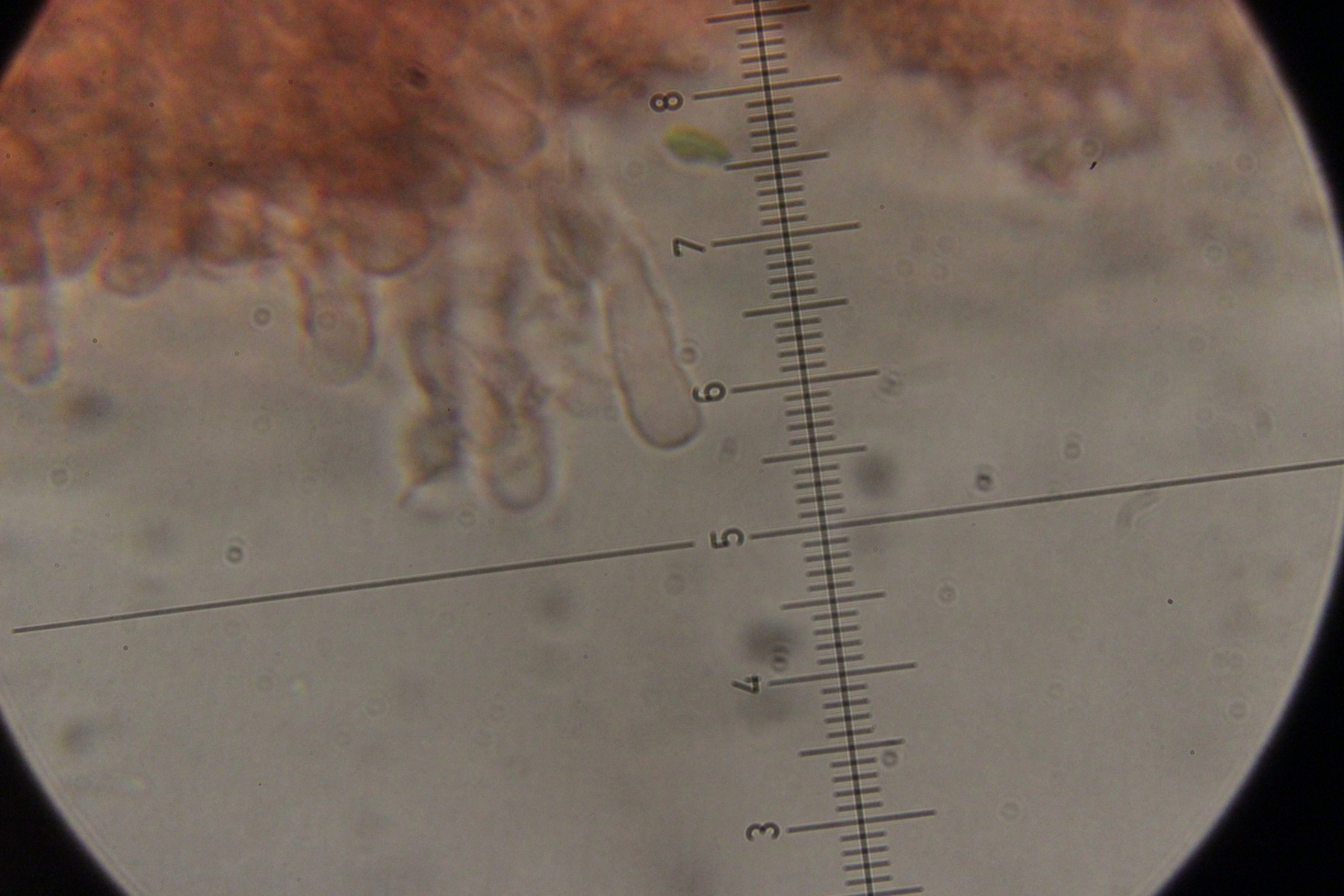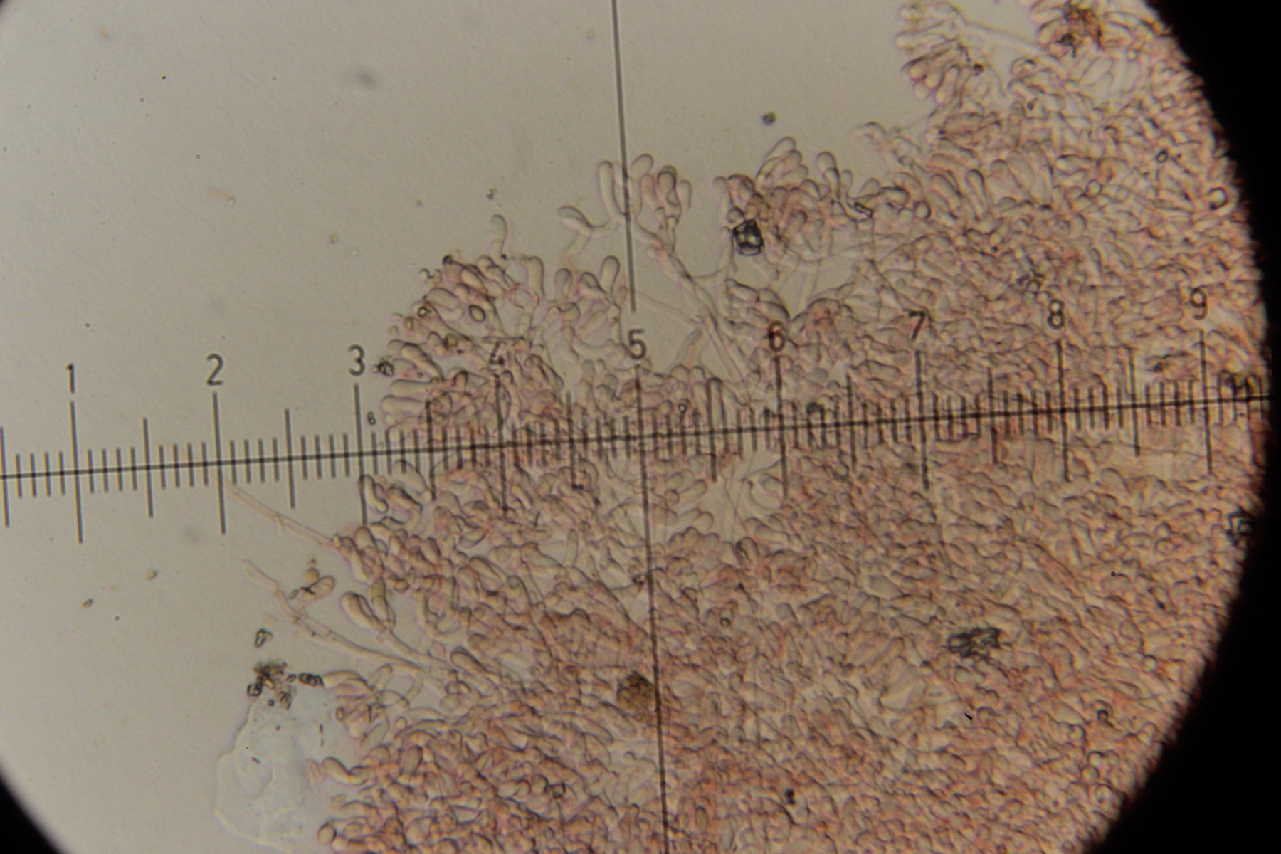 Macht dann im Mittelwert 9,2 µm x 7,8 µm, womit ich mich zu Hypochnicium albostramineum durchschlüsseln würde.