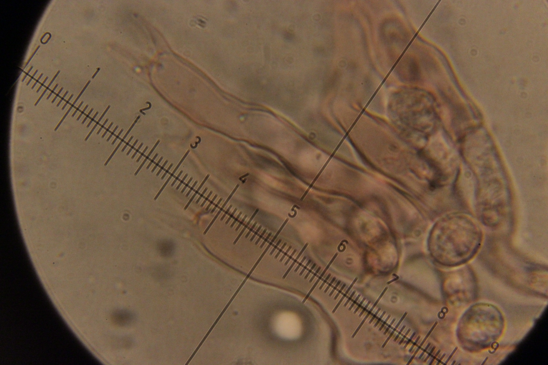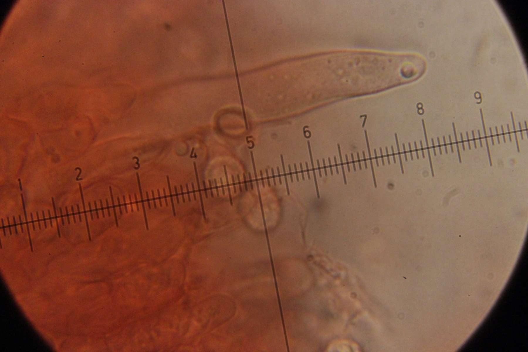 Und wenn man die unters Mikroskop legt, sieht man vereinzelt dann Dinge, die schon nach Zystiden aussehen